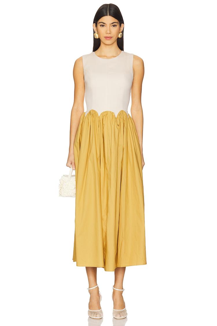 Soft matte cream fabric meets a mustard pleated skirt in this elegant midi fit and flare dress. The sleeveless round neckline and concealed back zipper create a sleek, fitted bodice, while the heavyweight plisse fabric adds texture and structure to the flowing skirt. Fully lined for comfort, this classic silhouette transitions effortlessly from brunch to cocktail parties or romantic date nights. A sophisticated choice for spring, summer, and autumn wardrobes, the dress balances timeless style with standout design details.