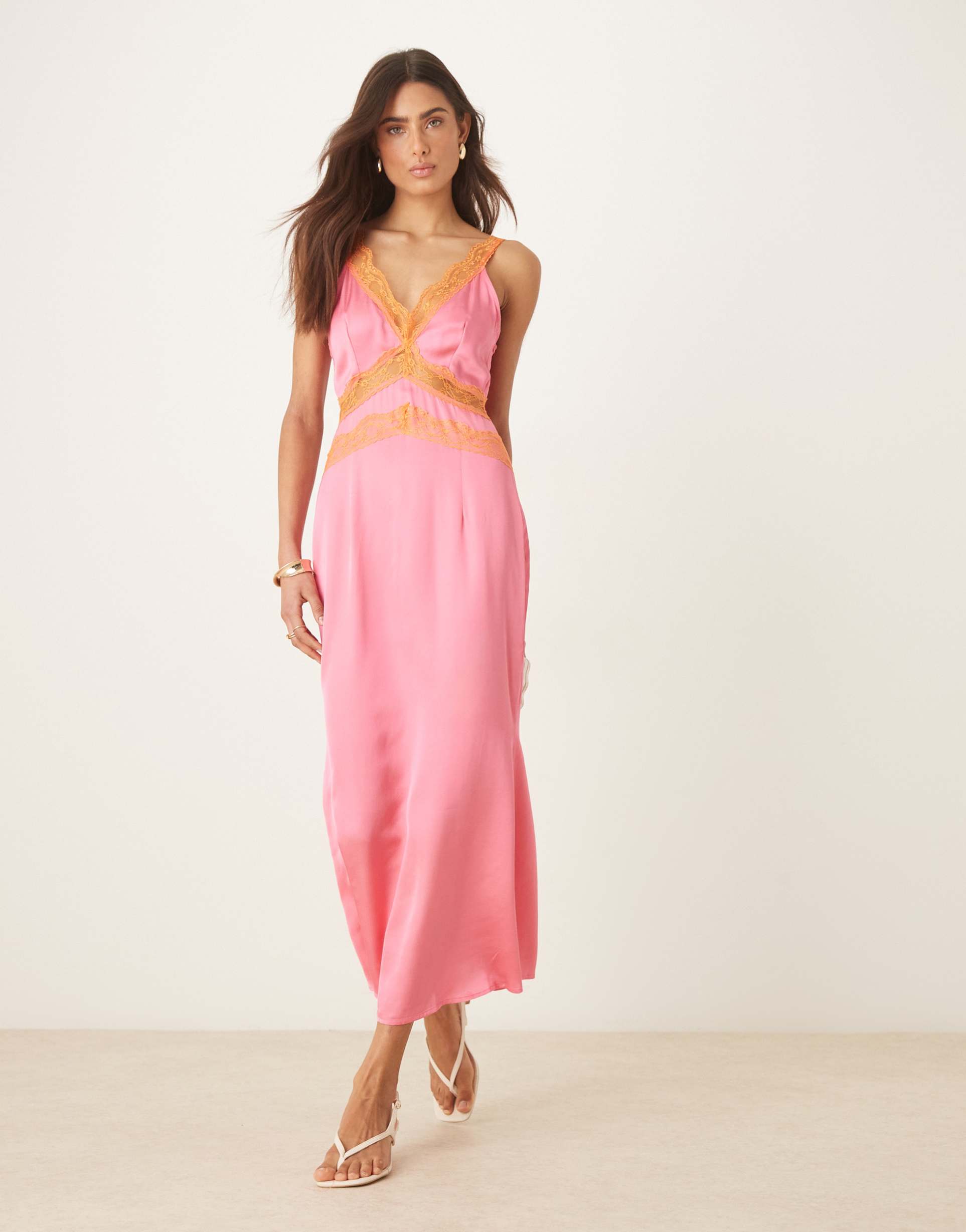 Soft satin-style fabric with a glossy, silky-smooth finish defines this elegant slip dress in pink and orange. Featuring a flattering V-neck and adjustable spaghetti straps, it offers a regular fit that skims the body effortlessly. The delicate contrast lace trims at the bodice add a romantic touch, while the side zipper closure ensures a seamless silhouette. Its midi length and sleeveless design make it perfect for spring and summer occasions like brunch, date nights, and cocktail parties.