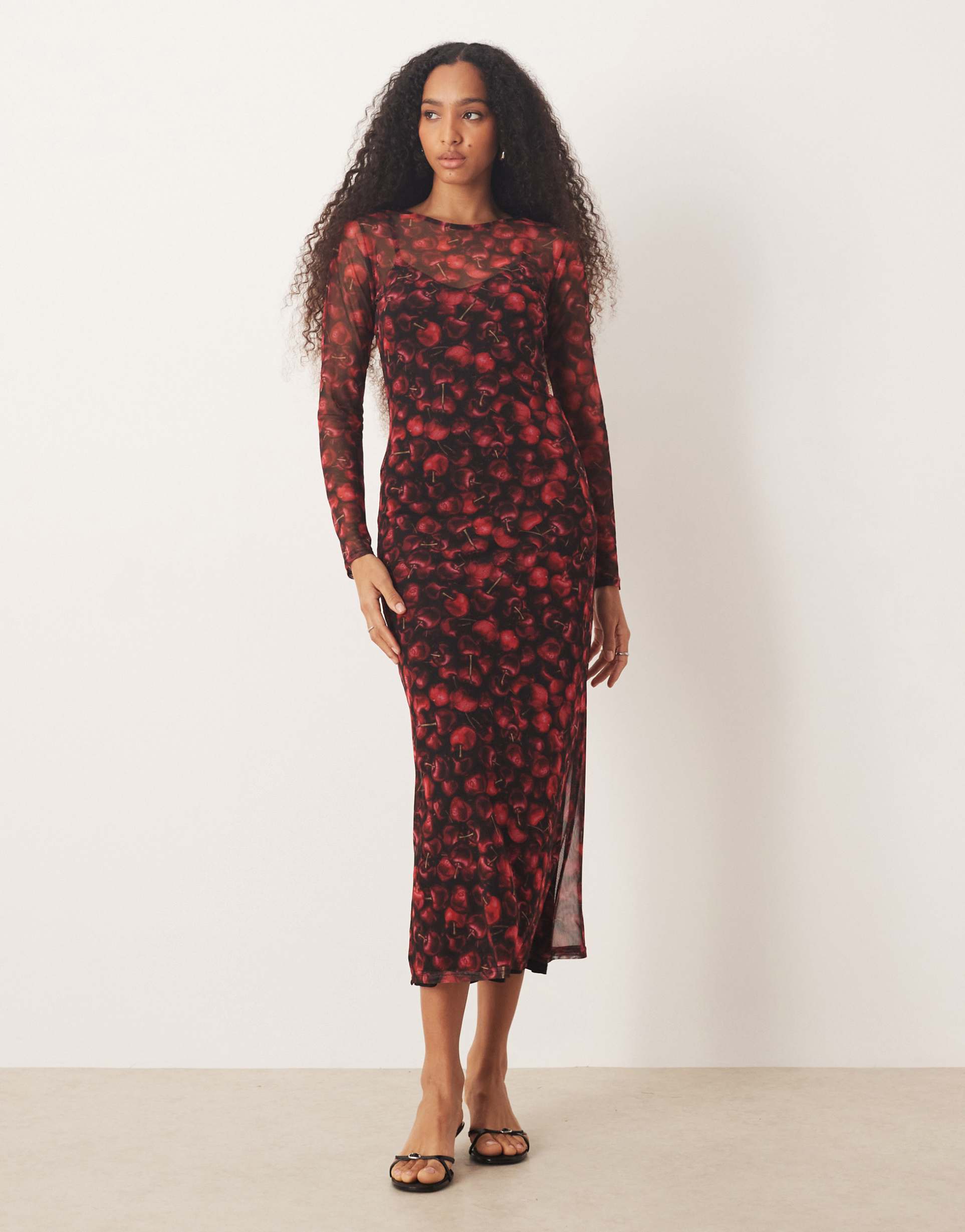 A fine, stretchy mesh fabric with a delicate red cherry floral print defines this slim-fitting sheath midi dress. Featuring long sleeves and a classic round neckline, it offers a sleek silhouette ideal for date nights, cocktail parties, or stylish evening outings. The side slit adds subtle movement and ease, while the sheer texture enhances its modern, sexy appeal. Perfect for transitional seasons like spring and autumn, this dress pairs effortlessly with simple heels for a confident, polished look.