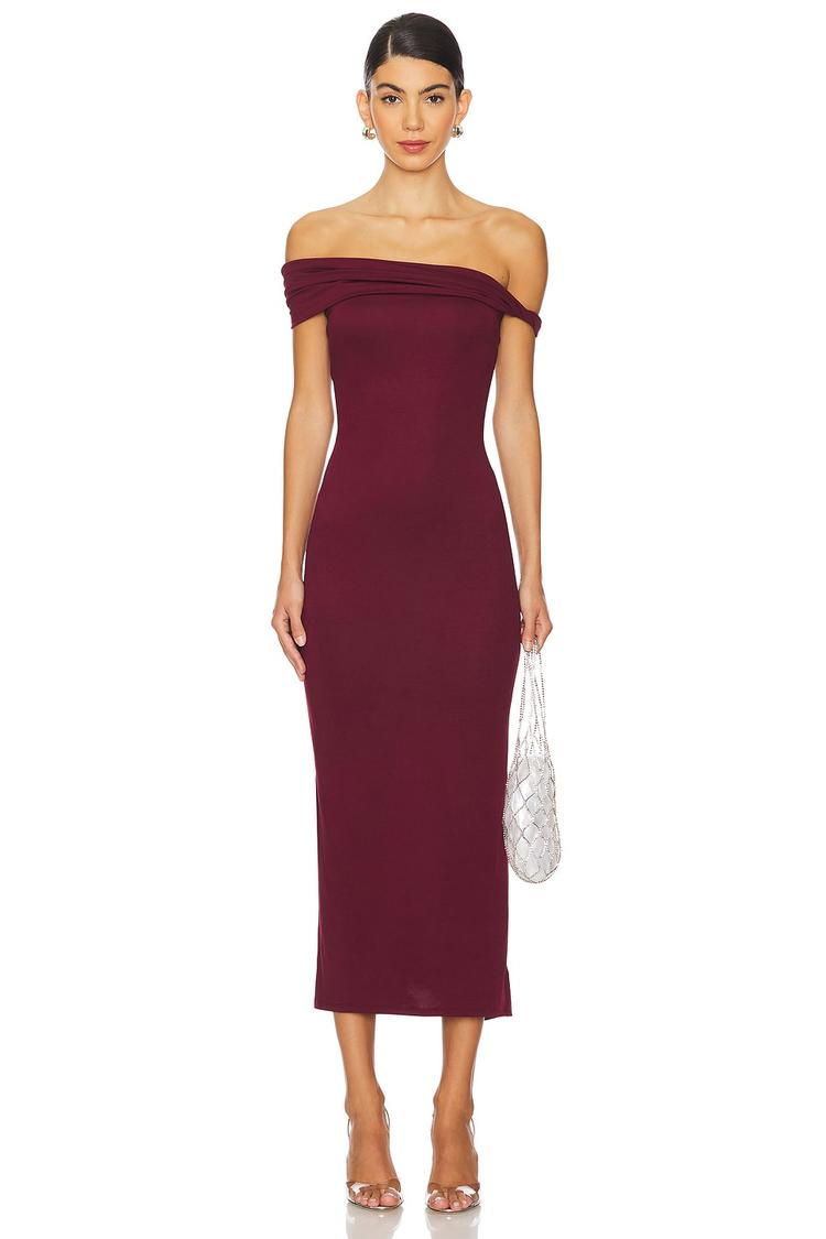 burgundy off-shoulder midi dress