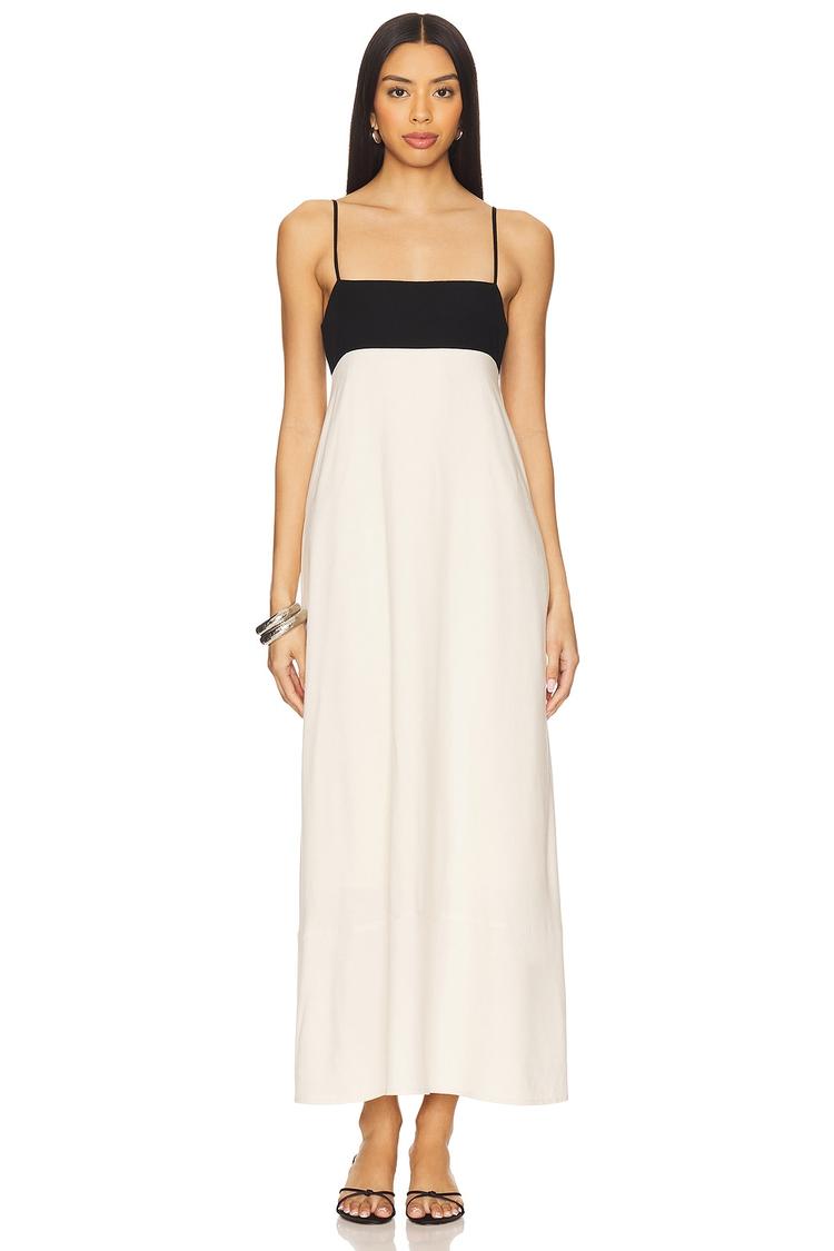 A striking contrast of matte black bodice and flowing matte ivory skirt defines this empire waist maxi dress. Crafted from breathable cotton, its straight neckline and delicate spaghetti straps create a minimalist silhouette perfect for warm spring and summer days. The relaxed fit and clean hemline enhance effortless elegance, while practical pockets add functional charm. Ideal for casual outings, brunch with friends, or vacation strolls, this dress blends comfort with chic simplicity for versatile everyday style.