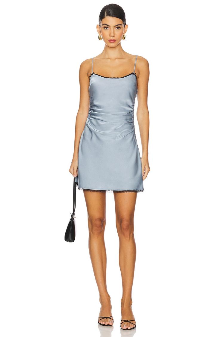 Soft satin fabric in a matte light blue hue defines this fitted slip dress with a straight neckline and delicate spaghetti straps. The mini length and lace trim border add feminine detail, while adjustable shoulder straps ensure a perfect fit. Concealed side zipper closure maintains sleek lines. Ideal for spring and summer nights, this minimalist and sexy silhouette transitions effortlessly from date nights to cocktail parties and evening outings.