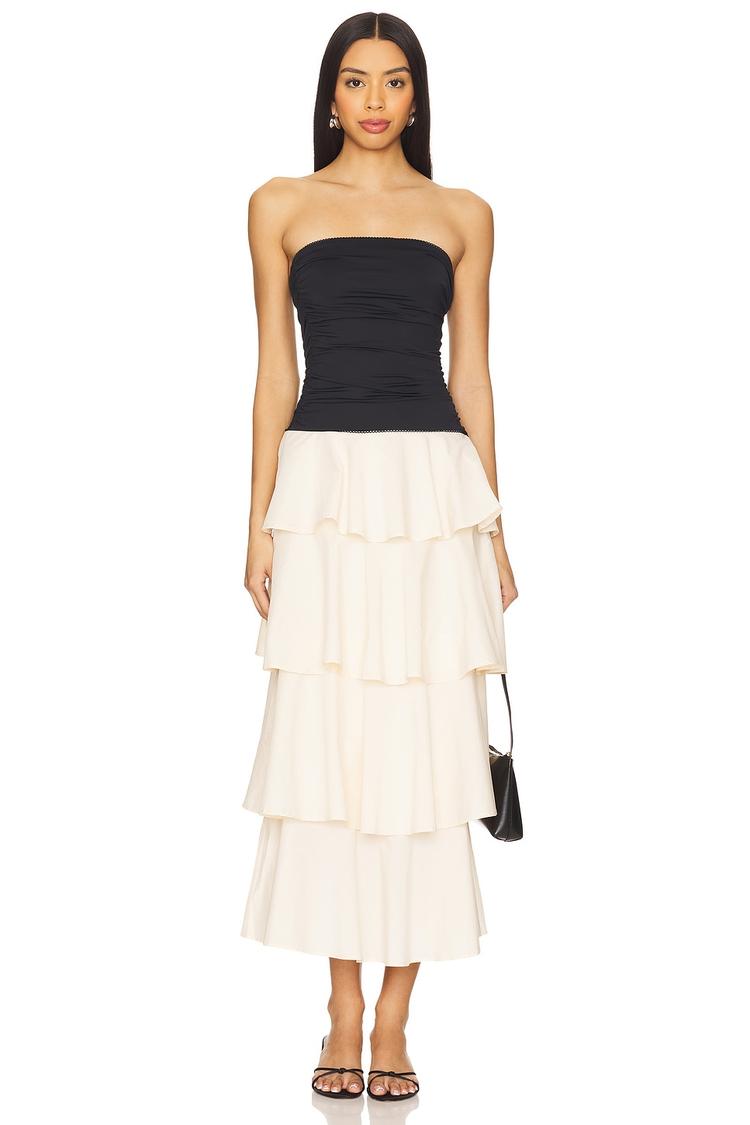 The Mathilda Dress features a sleek, fitted black bodice with a strapless straight neckline and a scalloped trim that adds a delicate touch. Its flowing cream tiered skirt creates a layered, midi-length silhouette perfect for spring and summer occasions. Crafted from a comfortable cotton-polyester blend with a hint of spandex for stretch, this elegant A-Line dress offers a concealed side zipper for a smooth fit. Ideal for brunches, date nights, or cocktail events, it blends classic sophistication with modern design details for versatile wear.