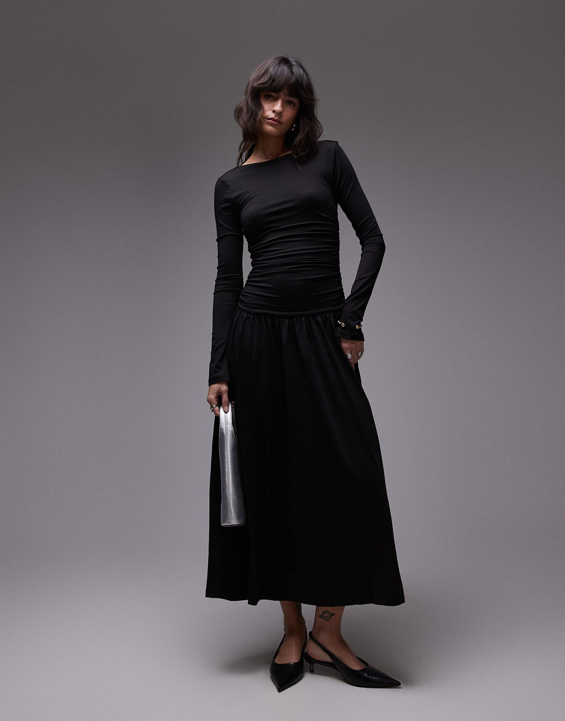 NIA SERA SLINKY LONG SLEEVE RUCHED MIDAXI DRESS IN BLACK