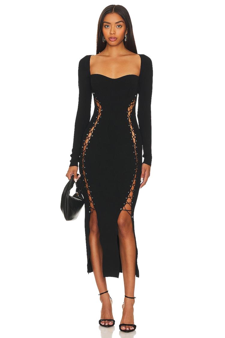 A figure-hugging sheath silhouette defines this matte black midi dress crafted from a midweight ribbed knit jersey blend of rayon, nylon, and spandex. The long sleeves and elegant sweetheart neckline add modern sophistication, while the daring side cut-outs feature lace-up details that create subtle peek-a-boo effects. Slit hemlines enhance movement and allure, perfect for autumn and winter evenings. This fitted midi dress is designed for seamless pull-on wear and suits date nights, cocktail parties, and night outs with its chic, sexy vibe.
