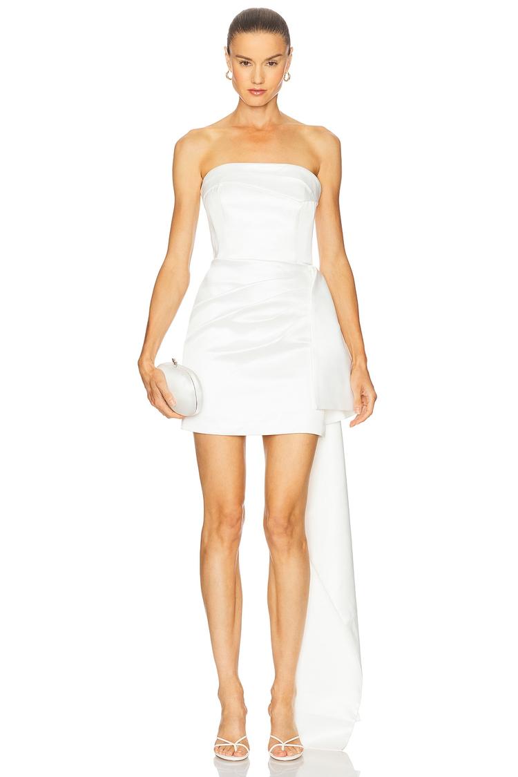 Clean lines and a sleek silhouette define this elegant mini sheath dress in crisp white satin. Featuring a strapless straight neckline and fitted cut, it flatters the figure while the dramatic draping detail cascading from the side adds a modern and sophisticated touch. The invisible back zipper ensures a smooth finish. Ideal for cocktail parties, night outs, or date nights, this versatile dress pairs perfectly with minimalist heels and delicate accessories for a refined look.