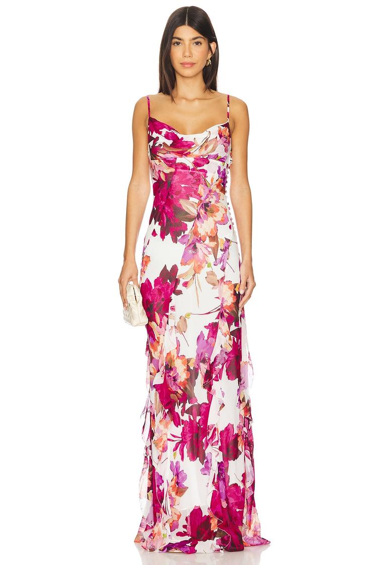 Soft georgette silk and a flowing maxi length create an elegant slip dress adorned with vibrant floral prints in shades of pink, red, and orange. The cowl neckline and delicate spaghetti straps enhance its sophisticated silhouette, while ruffle detailing on the front adds a romantic touch. Fully lined for comfort, this dress fits slim and features partial side button closure with adjustable straps. Ideal for spring and summer occasions, it effortlessly suits cocktail parties, formal events, and date nights, blending classic elegance with modern feminine charm.