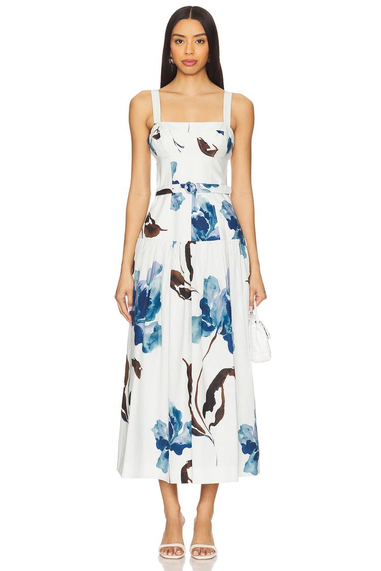 Sun-drenched days call for the breezy elegance of this midi fit and flare dress featuring a structured bustier bodice and a flattering square neckline. Crafted from a midweight linen-viscose blend, it promises breathable comfort and a smooth silhouette. The wide straps and concealed back zipper ensure a sleek fit, while the detachable tonal belt accentuates the waist. Adorned with a bold floral print in deep blue and brown hues on a crisp white base, this dress is perfect for beach vacations, brunches, or casual date nights.