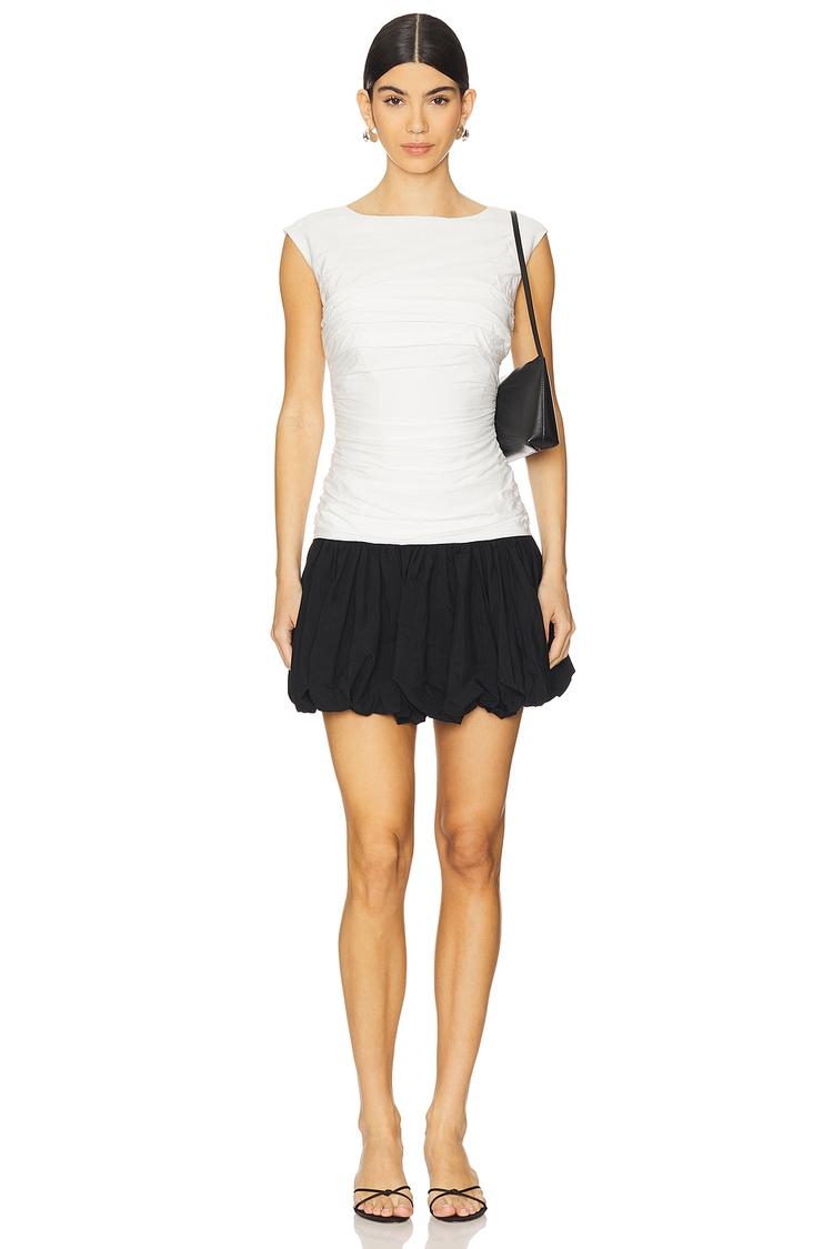 The Magda Mini Dress boasts a chic contrast with a fitted white ruched bodice and a playful black bubble hem skirt. Crafted from a midweight rayon-nylon blend with a cotton lining, it offers both comfort and structure. Its sleeveless design and boat neckline enhance a modern silhouette, complemented by discreet side pockets and a concealed back zipper with hook and eye closure. Ideal for spring and summer, this versatile shift dress suits brunches, night outs, and date nights with effortless sophistication.