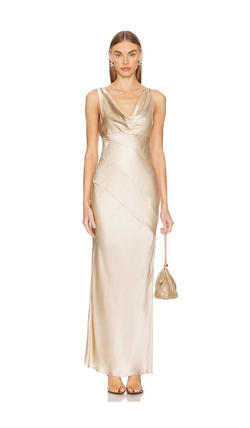 NICHOLAS SALLY COWL NECK MAXI DRESS IN METALLIC NEUTRAL.