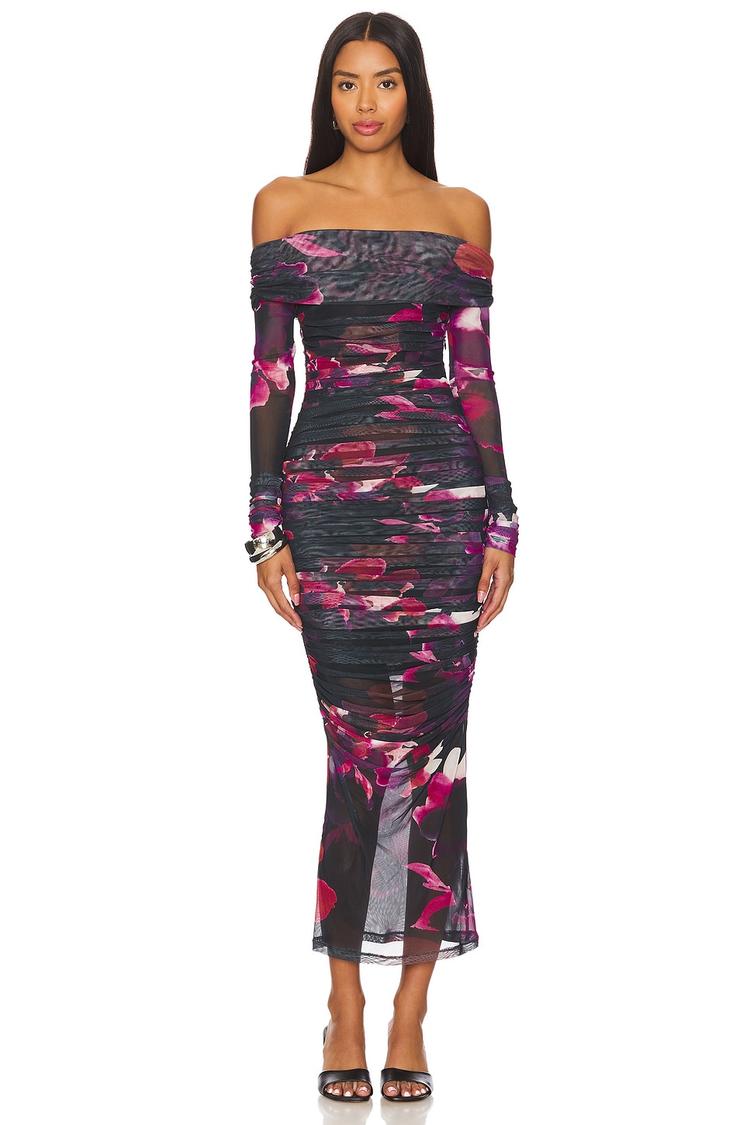 Soft mesh fabric and a fitted sheath silhouette combine in this off-shoulder midi dress, featuring long sleeves and smocked detailing across the bodice and sleeves. The abstract pattern in shades of fuchsia and dusty rose over matte black adds a modern, sexy edge while the hidden side zipper ensures a sleek finish. This semi-sheer piece is perfect for cocktail parties, date nights, and stylish evening outings during spring, summer, or autumn.