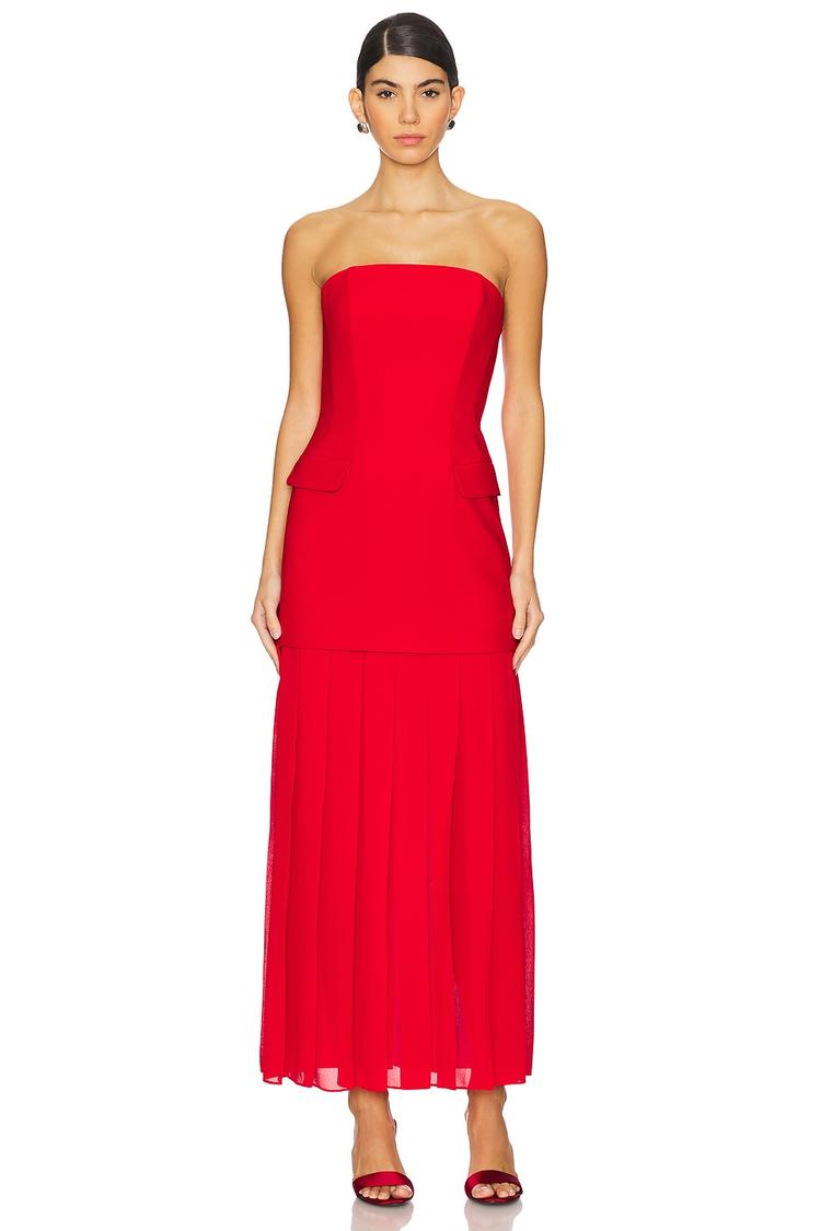 A striking red column silhouette features a strapless straight neckline and a fitted bodice that enhances an elegant figure-flattering look. Crafted from midweight crepe polyester, this midi-length dress includes delicate pleats on the skirt and subtle front faux flap pockets, offering timeless sophistication. The hidden back zip closure maintains a seamless appearance, making it ideal for cocktail parties, semi-formal events, and formal occasions. Fully lined for comfort, this versatile dress promises a polished presence throughout the year.