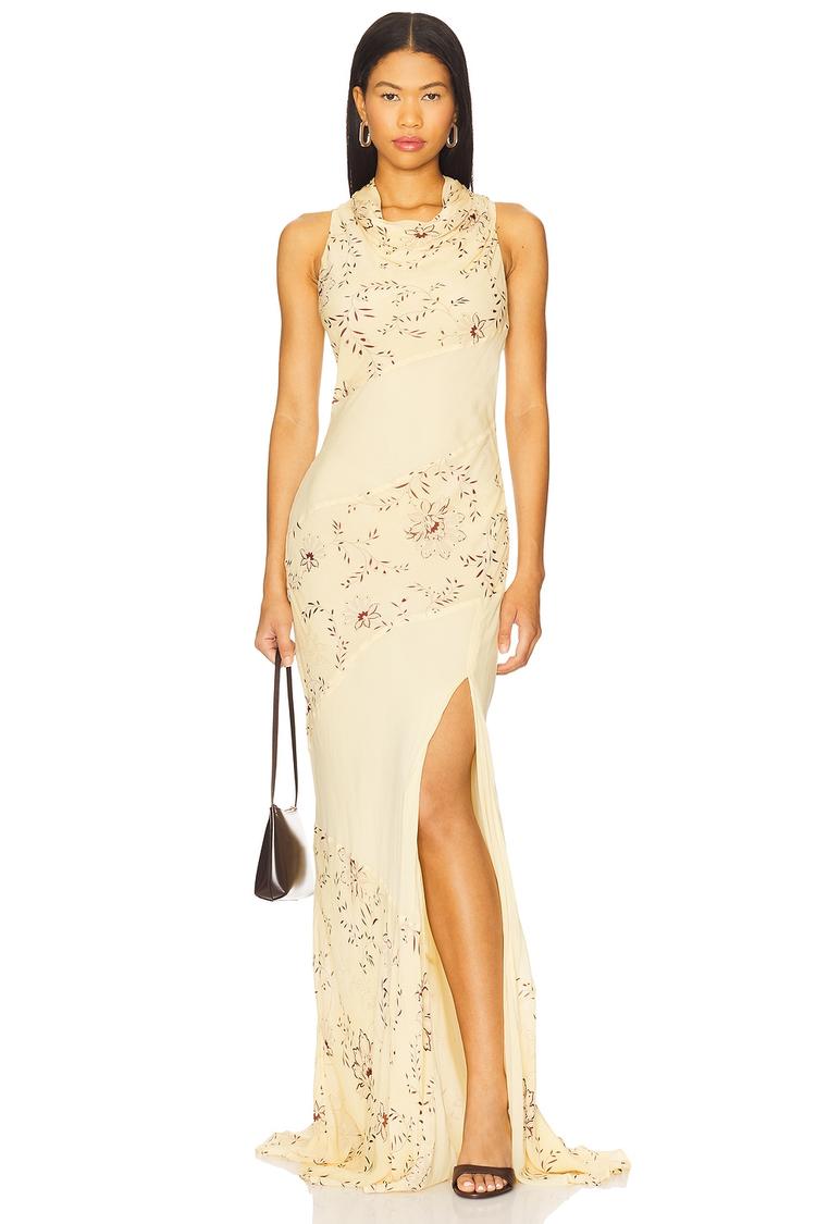 Softly draped necklines and a sleek column silhouette define this elegant maxi dress in a warm beige hue. Crafted from heavyweight georgette viscose, it offers a refined slim fit with a graceful side slit that adds a subtle allure. Perfectly suited for formal events, cocktail parties, and weddings, the covered back with button loop and tie closure ensures a polished finish. Fully lined for comfort and sophistication, this dress embodies timeless elegance ideal for spring through autumn occasions.