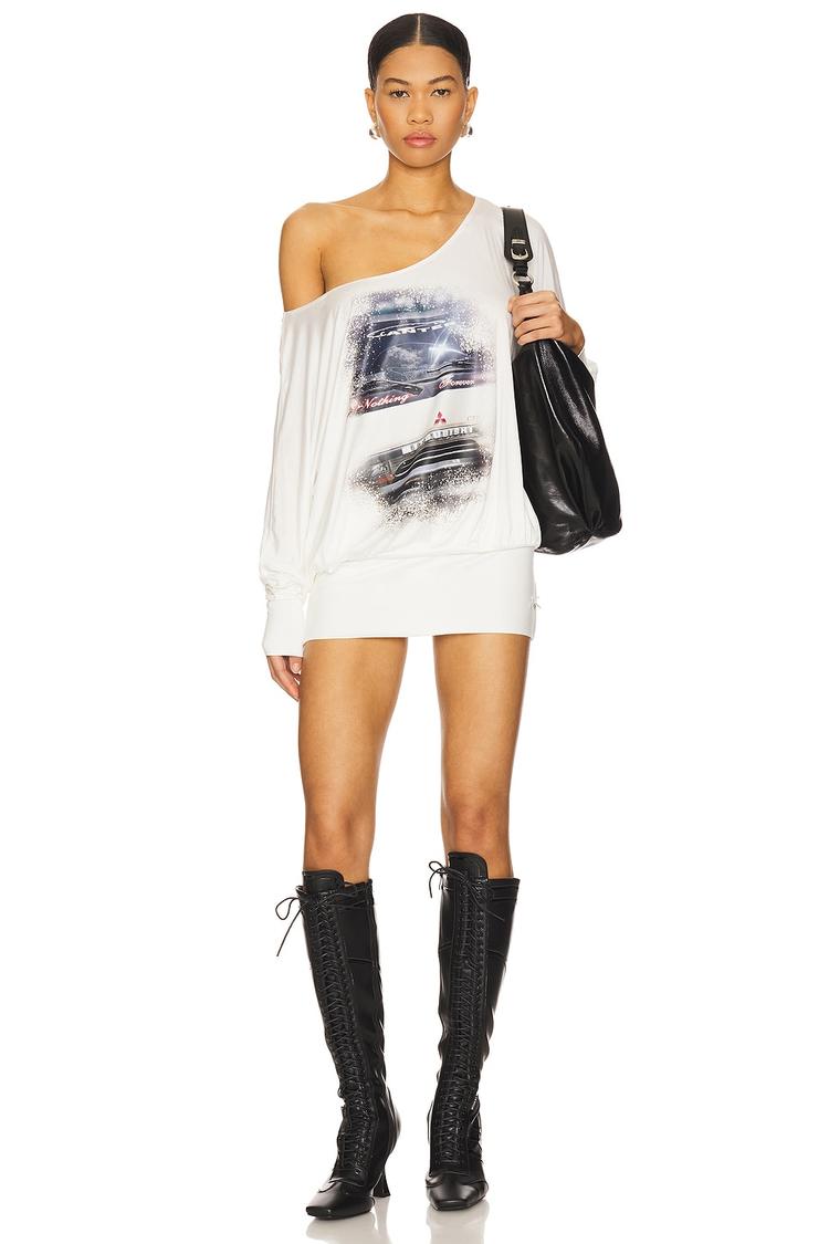 Soft, midweight jersey fabric and a relaxed fit define this off-white mini sweater dress with long sleeves and a striking one-shoulder strap neckline. The pull-on styling offers easy wear, while the bold screen-printed graphic at the front adds an edgy, trendy appeal. Perfect for casual outings, night outs, or date nights in cooler seasons, this dress combines comfort with style effortlessly, making it a versatile piece for autumn and winter wardrobes.