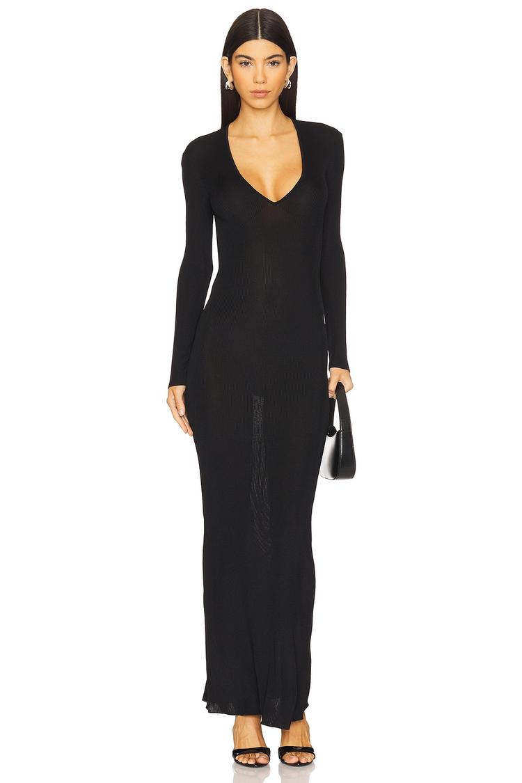 A sleek black knit sheath dress crafted from midweight viscose offers a form-fitting silhouette with a deep V-neckline and long sleeves, creating an elegant and sophisticated profile. The maxi length and clean hemline enhance its minimalist appeal, while the semi-sheer fabric adds a subtle allure perfect for date nights, cocktail events, or evening outings. This pullover style dress combines comfort and style, making it a versatile choice for autumn and winter wardrobes.