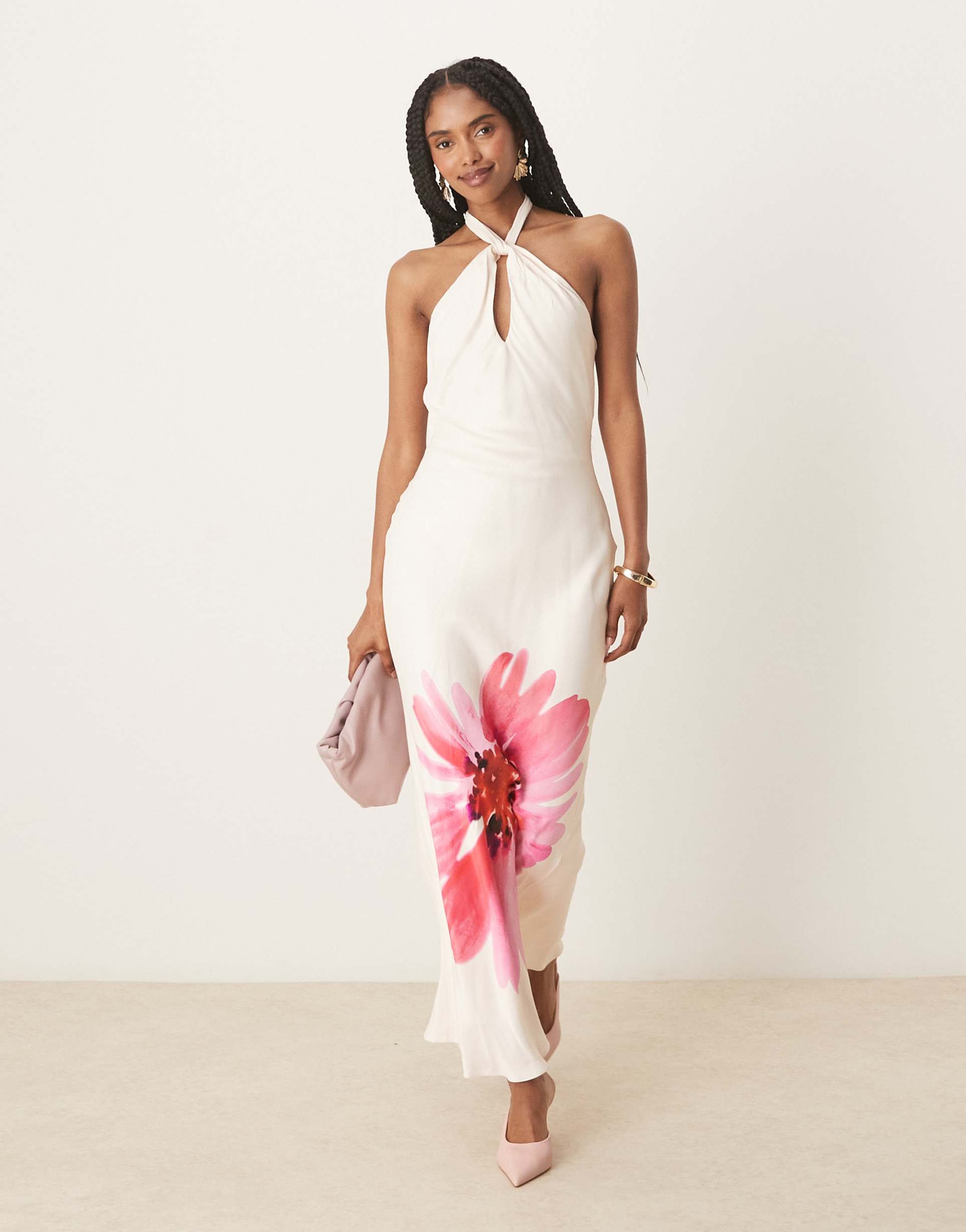 Soft viscose fabric and a halter neck create an elegant silhouette with a romantic edge in this white midi dress. The regular fit and sleeveless design offer comfort and style, while the bold floral print on the skirt adds a striking focal point. A cut-out detail at the neckline and tie-back closure enhance the sophisticated look. Ideal for spring and summer occasions such as brunch, date nights, and cocktail parties, this versatile dress blends simplicity with eye-catching design elements.