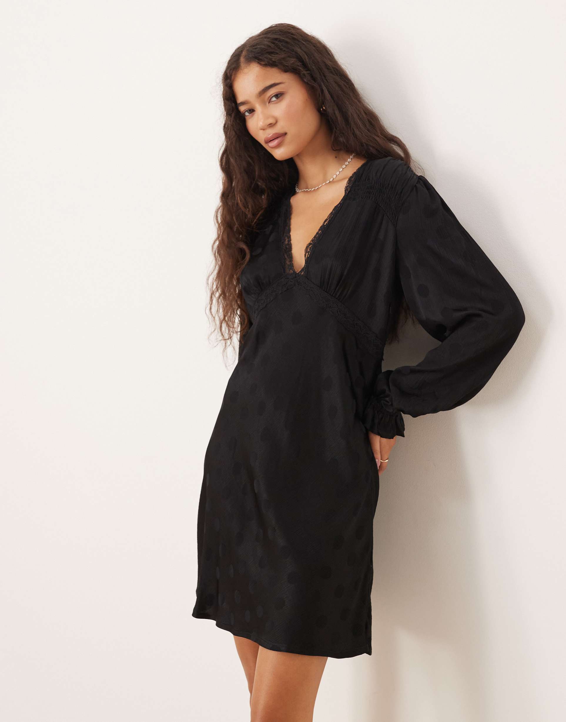 Soft viscose fabric combined with delicate lace trim creates a refined mini shift dress in classic black. Featuring a flattering V-neckline and long sleeves with lace accents at the cuffs, this regular fit silhouette offers effortless elegance. The clean hemline enhances its versatile appeal, making it ideal for casual brunches, intimate date nights, or chic everyday wear. A timeless piece that balances comfort and sophistication with subtle design details and a lightweight fabric perfect for all seasons.