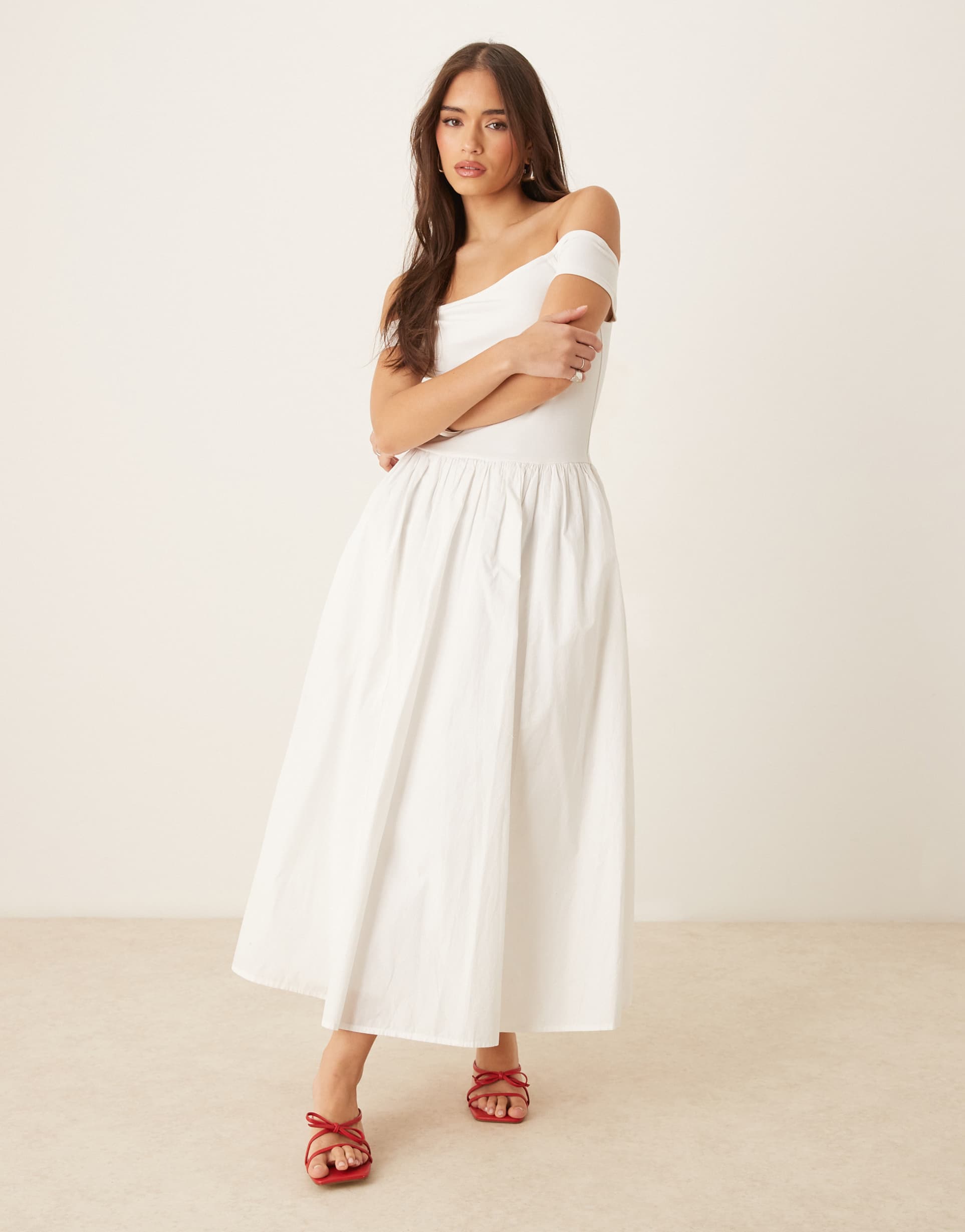 Soft cotton jersey fabric and a classic A-line silhouette define this bardot midi dress in crisp white. Featuring off-shoulder straps and a clean hemline, it offers a regular fit that flatters with understated elegance. Designed with concealed pockets for practical charm, this dress suits spring and summer days alike. Transition effortlessly from casual brunches to relaxed date nights, thanks to its timeless style and breathable cotton comfort.