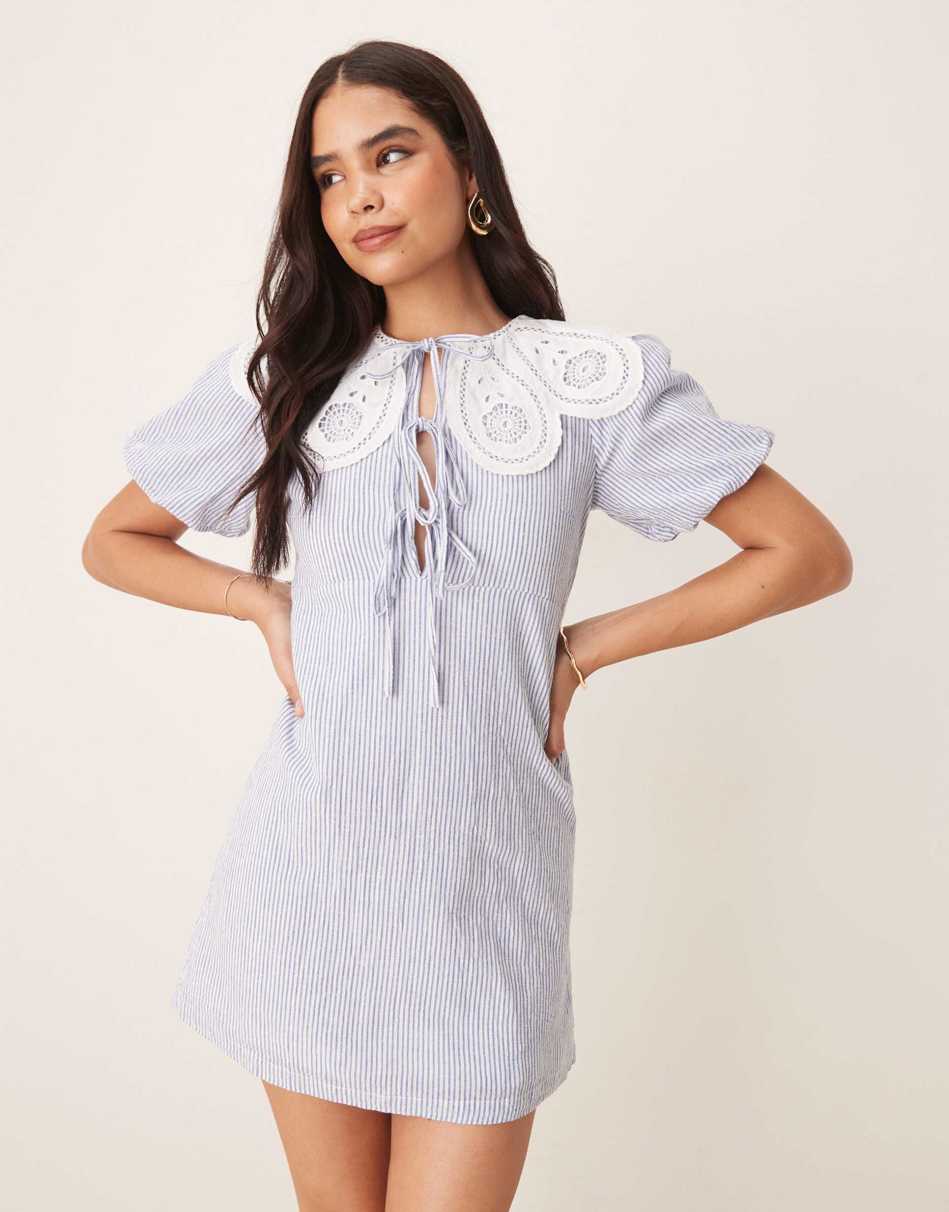 NOBODY'S CHILD BESSIE SCALLOP COLLAR DETAIL MINI SMOCK DRESS IN BLUE PINSTRIPE
