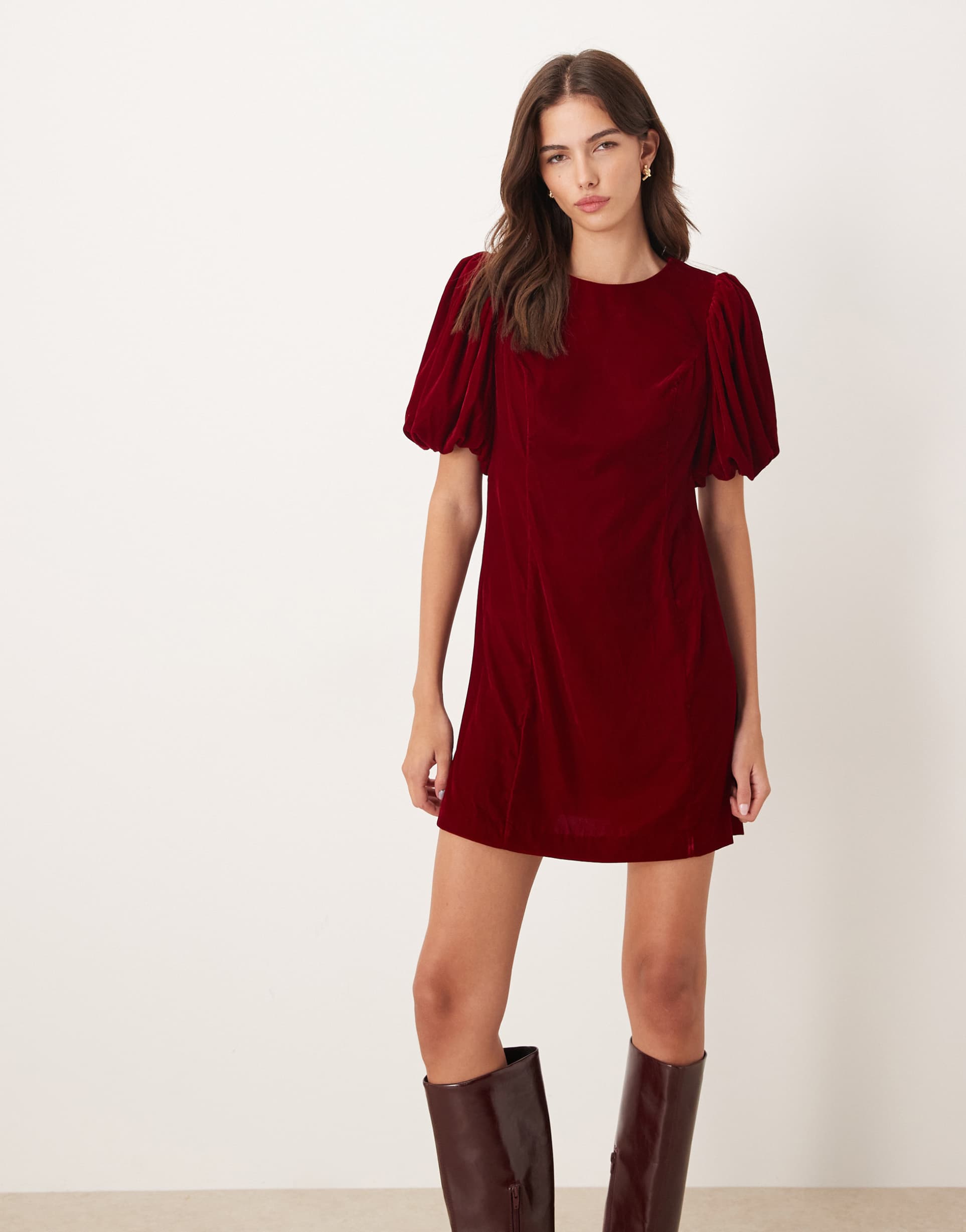 Rich velvet fabric in a deep red hue creates a plush and luxurious feel in this mini shift dress. The classic round neckline pairs perfectly with voluminous puffed half sleeves, adding a touch of romantic flair to the otherwise minimalist silhouette. Designed with a regular fit that skims the body gently, this dress is ideal for autumn and winter outings. Whether you're heading out for a casual day, a date night, or an evening gathering, this velvet mini dress combines comfort and style effortlessly.