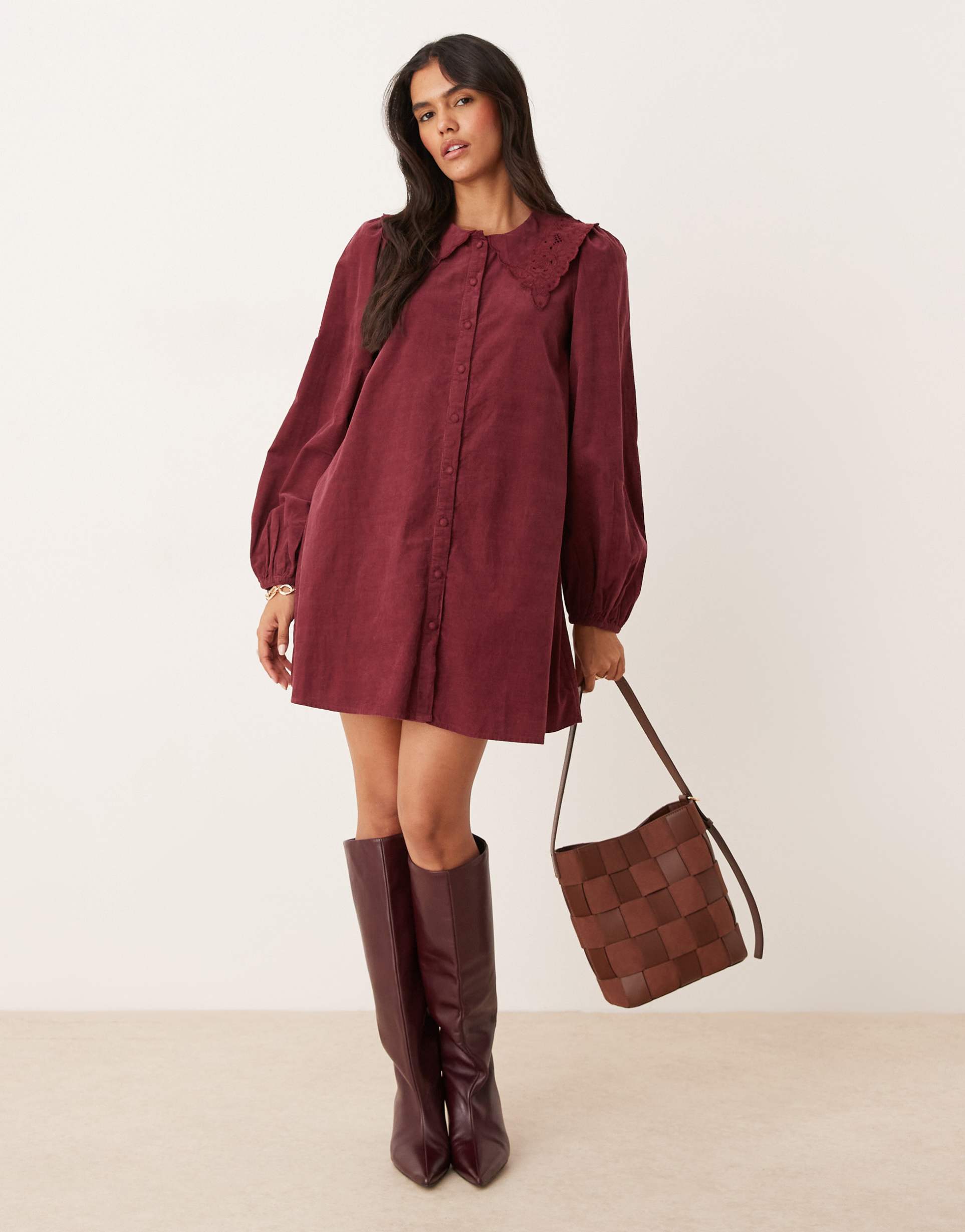 Rich matte burgundy corduroy fabric gives this mini smock dress a vintage yet casual chic vibe. The oversized collar and button-up front add classic details to the regular fit silhouette, complemented by long regular sleeves and a clean hemline. Crafted from soft cotton corduroy, this dress is perfect for autumn and winter outings. Whether for laid-back brunches, casual streetwear, or relaxed weekend occasions, its comfortable fit and timeless style make it a versatile addition to your wardrobe.