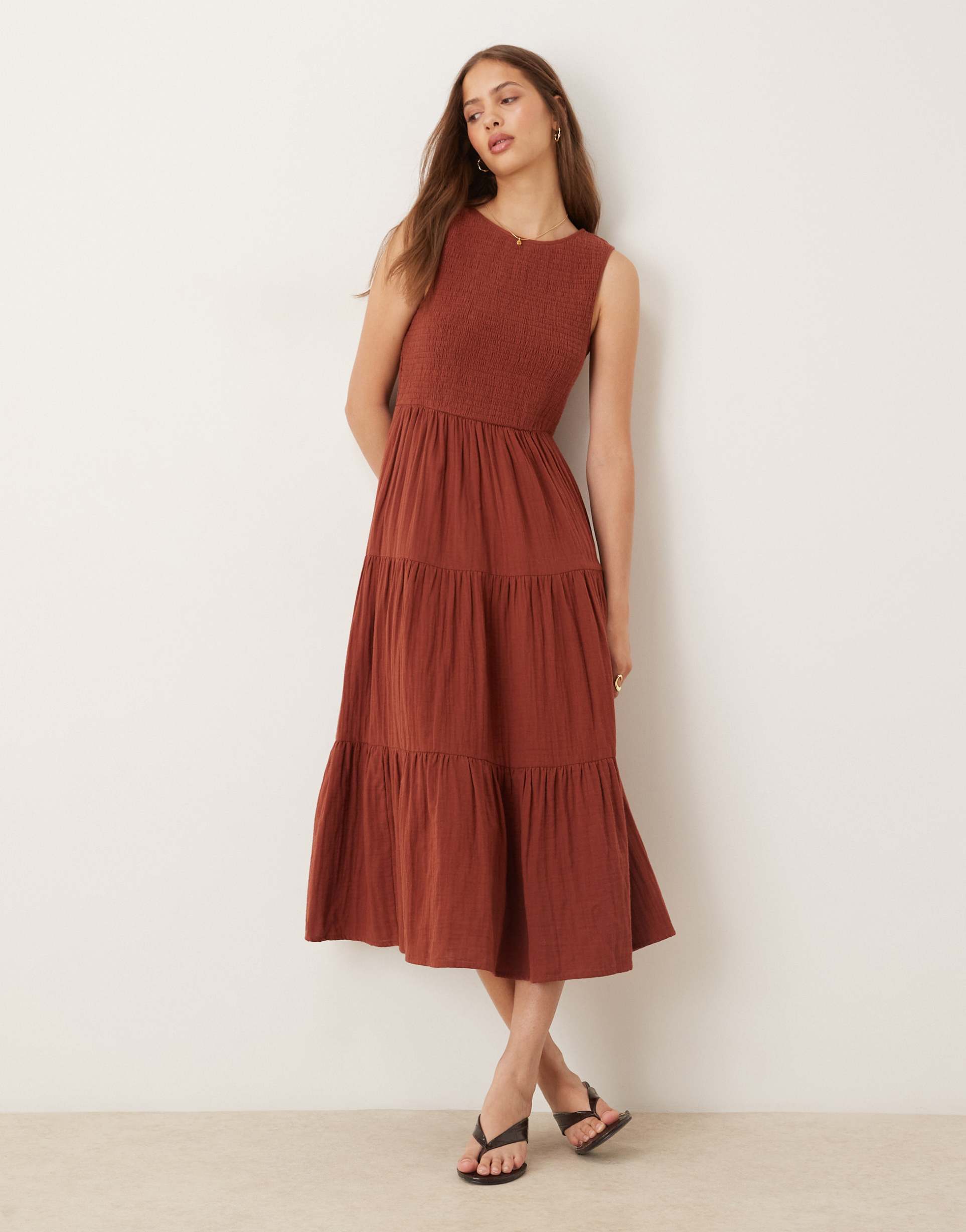 Soft matte brown cotton fabric shapes this sleeveless tiered midi dress with a regular fit, featuring a round neckline and a shirred bodice for subtle texture. The button-keyhole back adds a delicate touch, while the tiered hemline enhances its casual chic vibe. Ideal for warm spring and summer days, this dress suits casual outings, brunches, and everyday wear with effortless style and comfort.