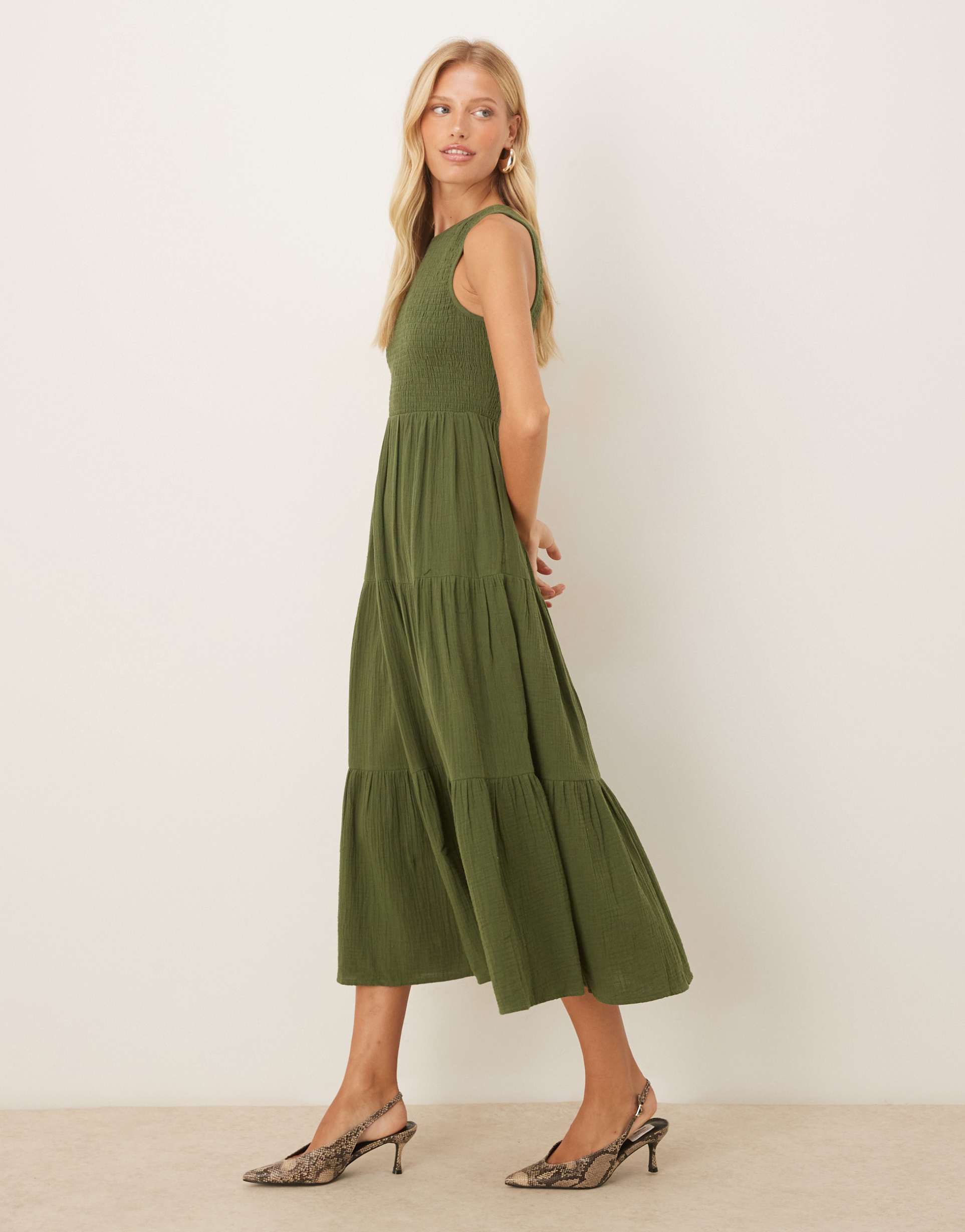 Soft cotton woven fabric and a tiered swing silhouette create an effortlessly stylish midi dress in matte olive. The regular fit and sleeveless cut with a round neckline offer comfortable wear, while the button-keyhole back adds a subtle design touch. Layered hemline tiers enhance the dress's casual chic vibe, making it ideal for spring through autumn. Perfect for casual outings, brunch dates, or everyday wear, this versatile dress blends comfort with laid-back elegance.