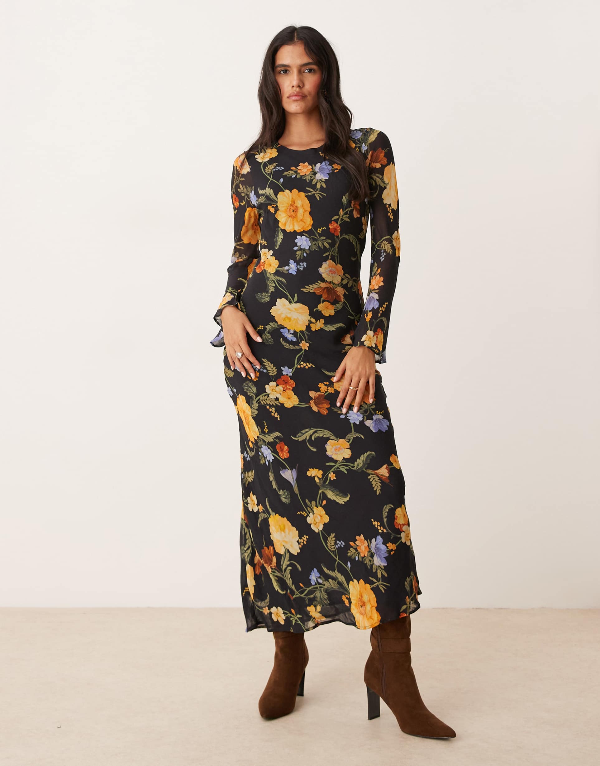 Soft viscose fabric with a matte black base showcases a romantic all-over floral print in mustard, purple, and green hues. The shift silhouette is midi-length with a regular fit, featuring a classic round neckline and elegant long flared sleeves. A back zipper closure ensures a smooth fit. This dress transitions effortlessly through autumn and winter, ideal for casual days, brunch dates, or a relaxed night out. Its timeless style and comfortable fabric make it a versatile addition to any wardrobe seeking a touch of classic charm.