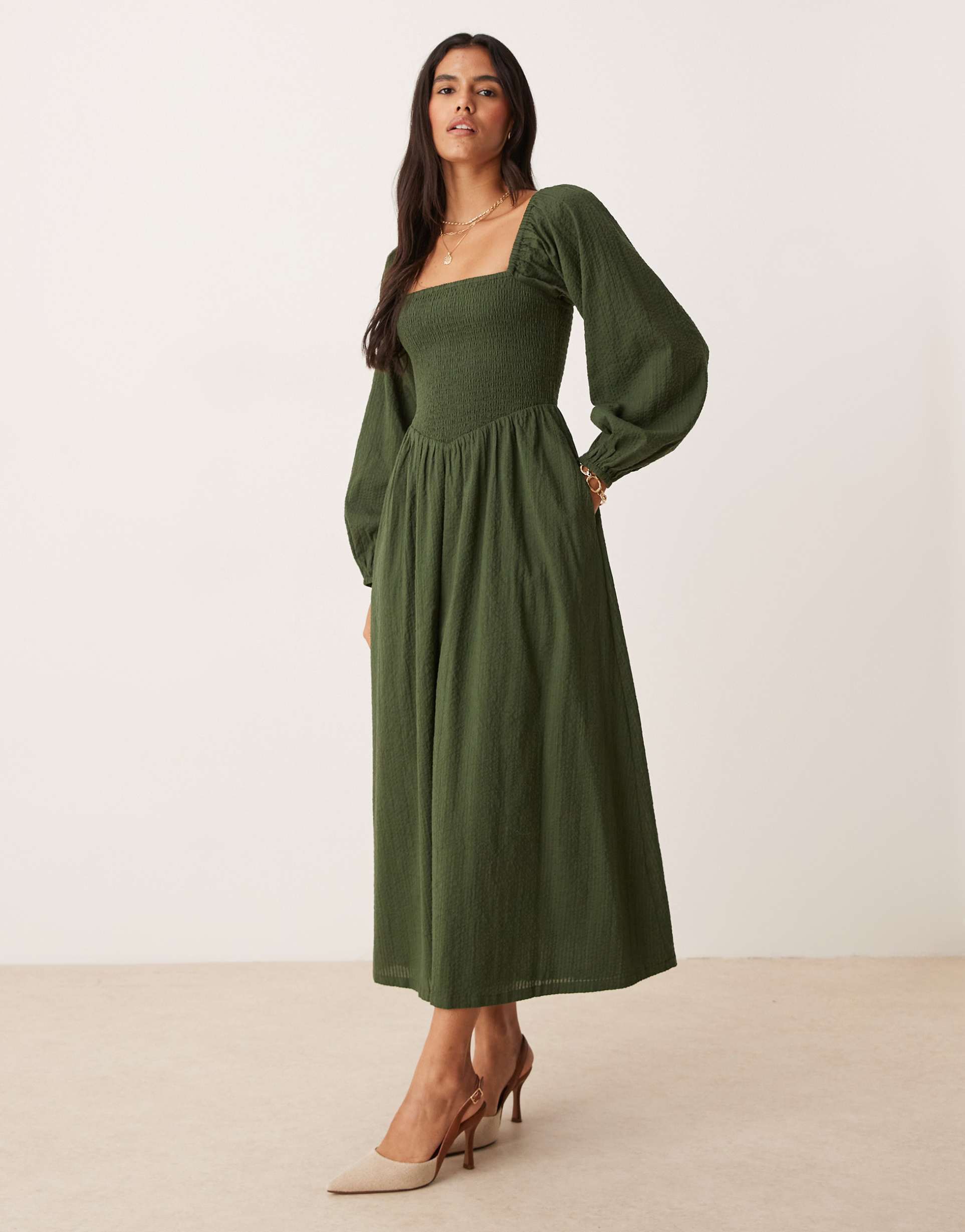 An effortlessly elegant midi dress in matte dark green cotton features a flattering empire waist and a square neckline that adds timeless charm. The shirred bodice and regular fit provide comfort and shape, while long regular sleeves and side pockets enhance practicality. This classic, casual chic dress transitions beautifully across spring, summer, and autumn, making it ideal for casual outings, brunch dates, or everyday workwear. Its clean hemline and plain solid color emphasize simplicity with a touch of refined style.