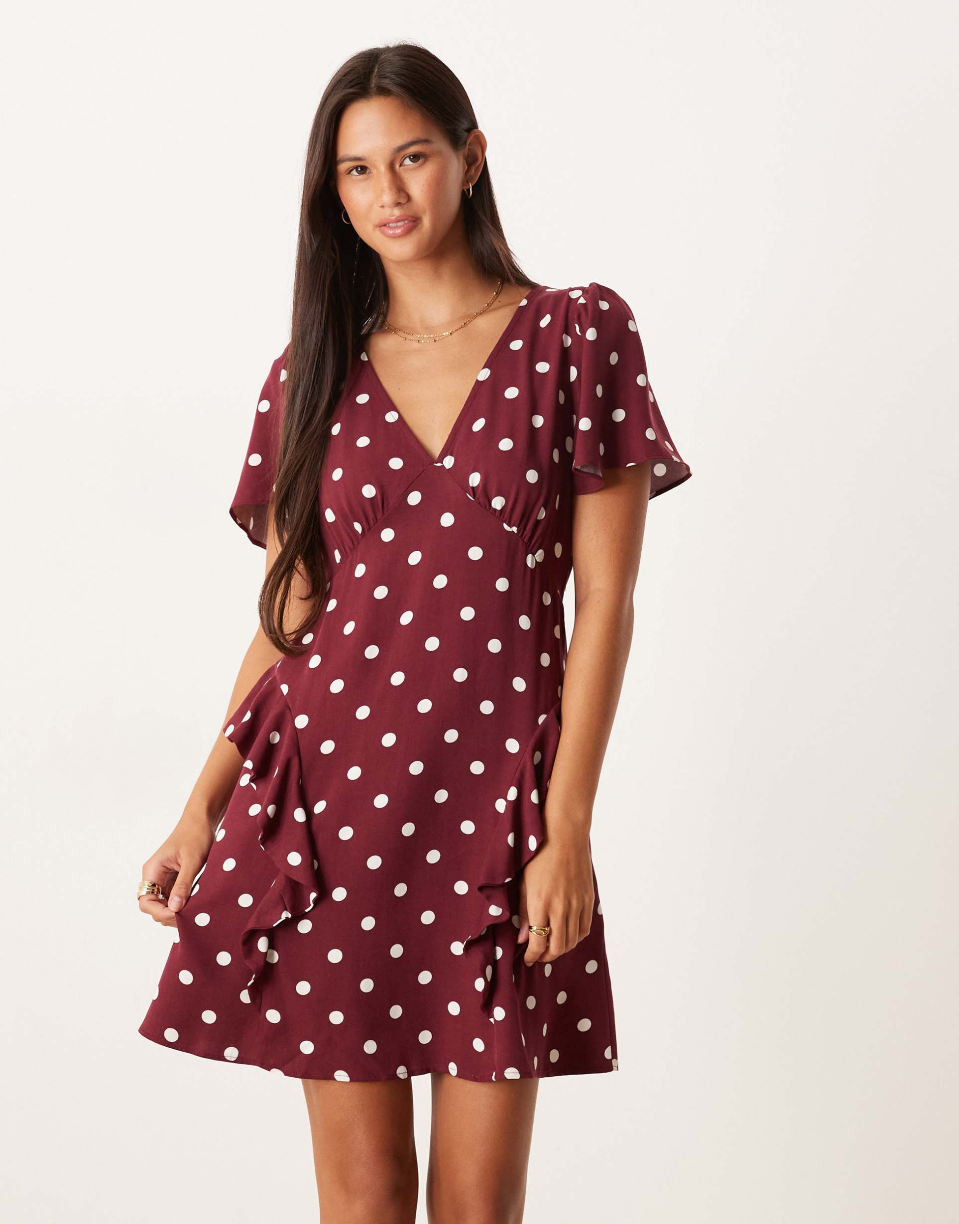 Brown spot polka dots and flutter sleeves give this mini wrap dress a charming, classic look. Crafted from soft viscose fabric, it offers a regular fit that flatters while ensuring comfort. The V-neckline enhances its feminine appeal, complemented by ruffle details along the hem and front for added movement and style. Ideal for spring and summer, this versatile dress suits casual outings, brunch dates, and relaxed evenings out. Its playful yet elegant design makes it a must-have for those seeking a cute and comfortable everyday dress.