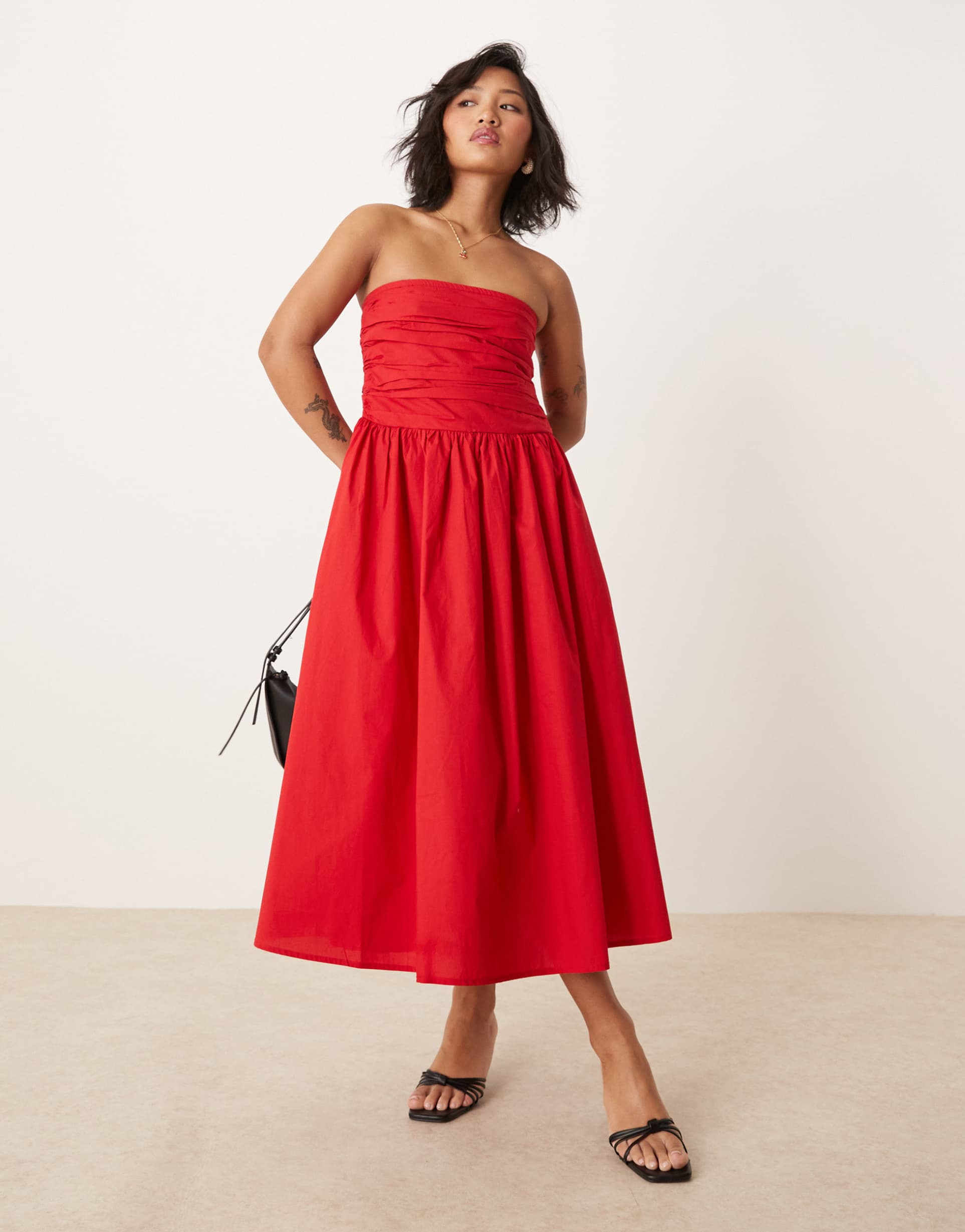 Soft, lightweight cotton in a vibrant matte red brings effortless charm to this petite A-Line midi dress. The strapless straight neckline and sleeveless design highlight the shoulders, while the pleated bodice adds texture and visual interest. Its regular fit and clean hemline create a flattering silhouette perfect for spring and summer days. Side pockets add subtle functionality. Ideal for casual outings, brunch dates, or relaxed evenings, this classic yet casual chic dress offers comfort and style in equal measure.