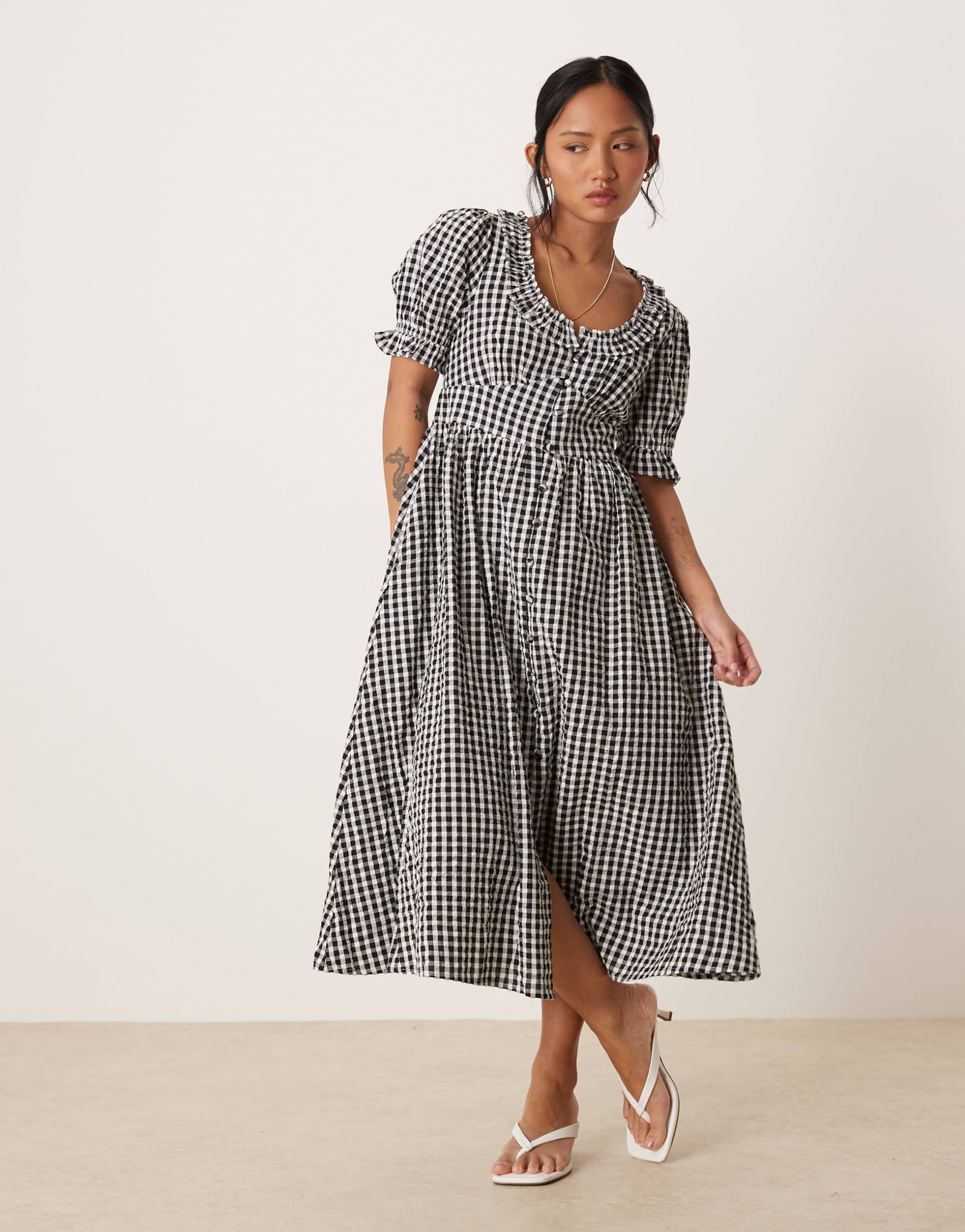 NOBODY'S CHILD PETITE FLOSSIE RUFFLE DETAIL MIDI DRESS IN BLACK GINGHAM