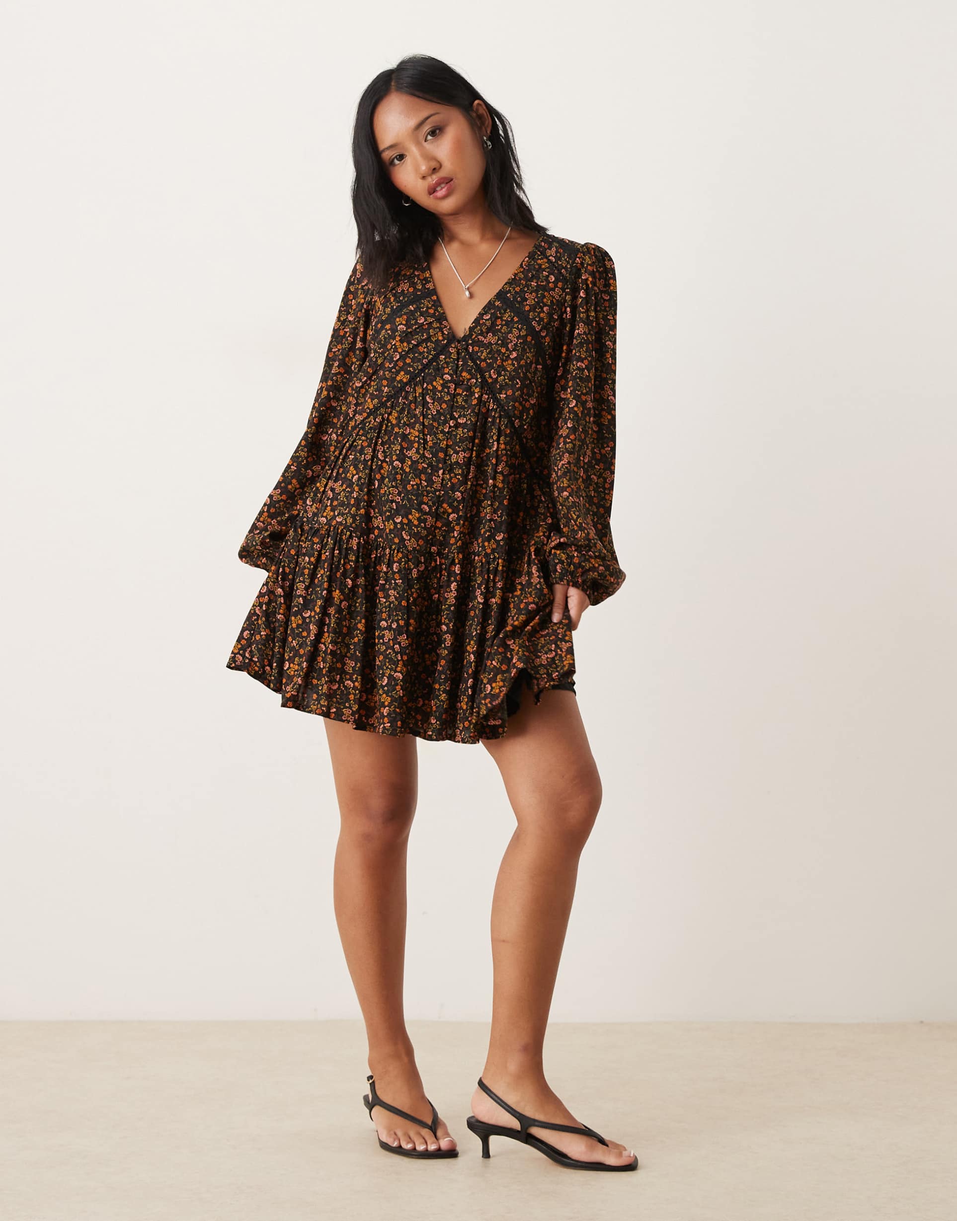 Soft viscose fabric and a playful babydoll silhouette define this petite mini dress in vibrant orange floral print. The deep V-neckline pairs beautifully with long blouson sleeves finished with ruffled hems and cuffs, creating a flattering regular fit that moves with ease. Ideal for casual outings, brunch dates, or relaxed evenings, this dress brings effortless bohemian charm to your warm-weather wardrobe. Its all-over floral pattern and ruffled detailing add feminine flair, making it a versatile piece to brighten up your spring, summer, or autumn style.