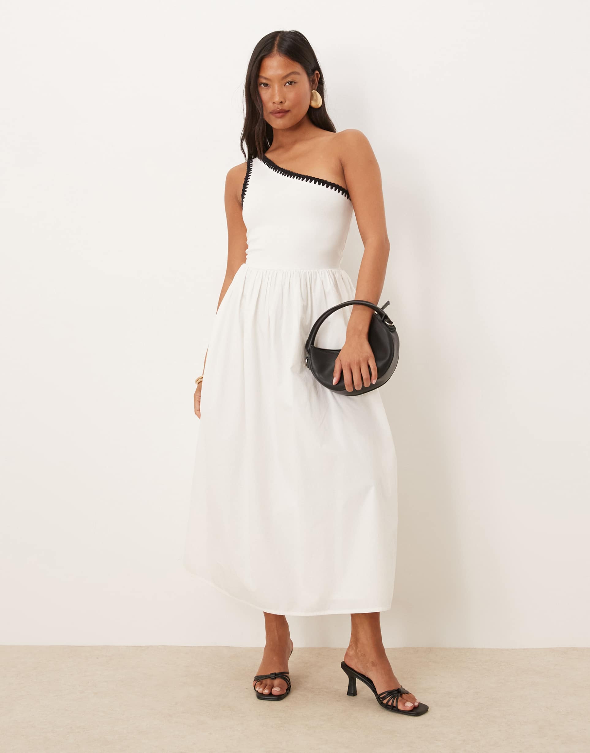 Soft cotton jersey fabric shapes this petite midi dress with a sleek asymmetric neckline and sleeveless styling. The regular fit and clean hemline combine comfort with understated elegance, while the striking black contrast trim on the single shoulder strap adds a modern minimalist accent. Ideal for spring and summer, this versatile white midi dress suits brunch outings, date nights, and cocktail events with ease. Its effortless slip-on design and casual chic vibe make it a refined yet approachable choice for petite wardrobes.