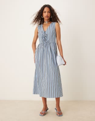 NOBODY'S CHILD POSEY TRAPEZE TIE DETAIL MIDI DRESS IN BLUE STRIPE