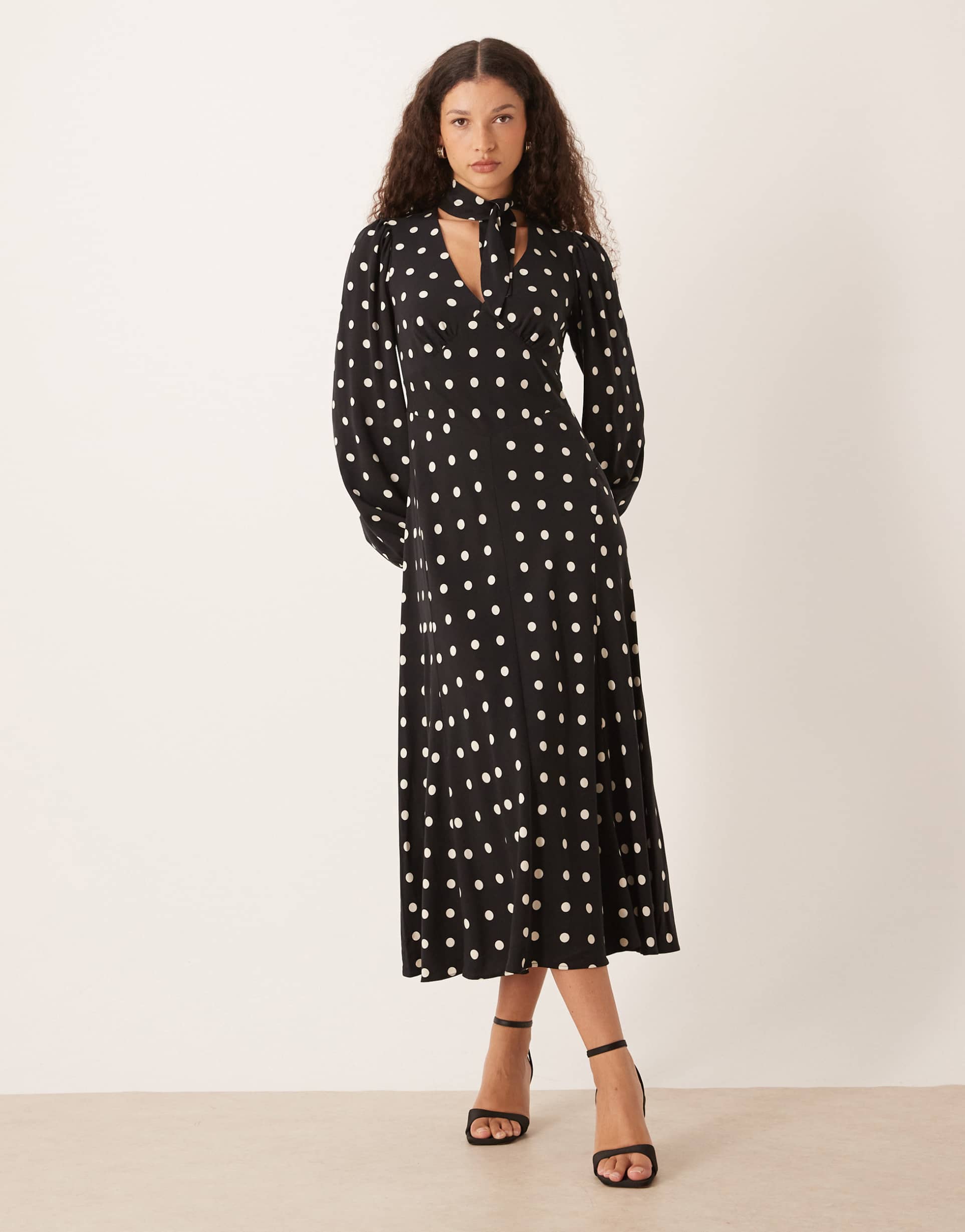 NOBODY'S CHILD SADIE TIE NECK MIDAXI DRESS IN BLACK AND WHITE SPOT