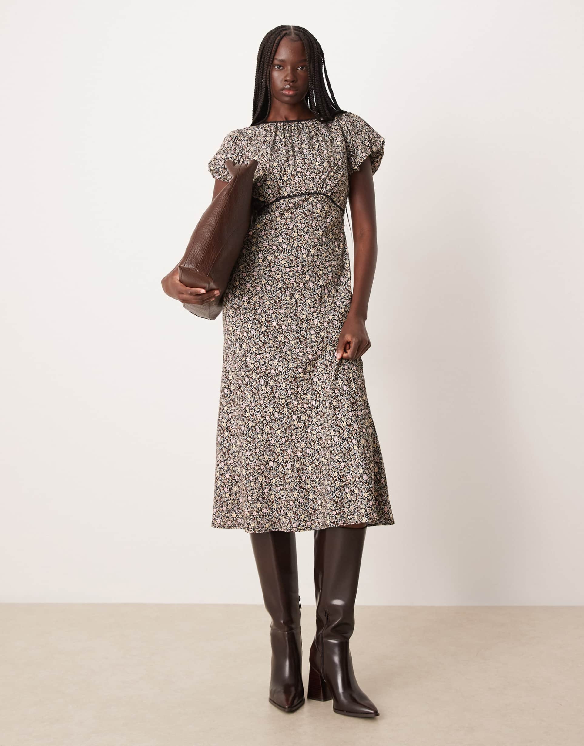 NOBODY'S CHILD SICILY MIDI TEA DRESS IN BLACK FLORAL PRINT
