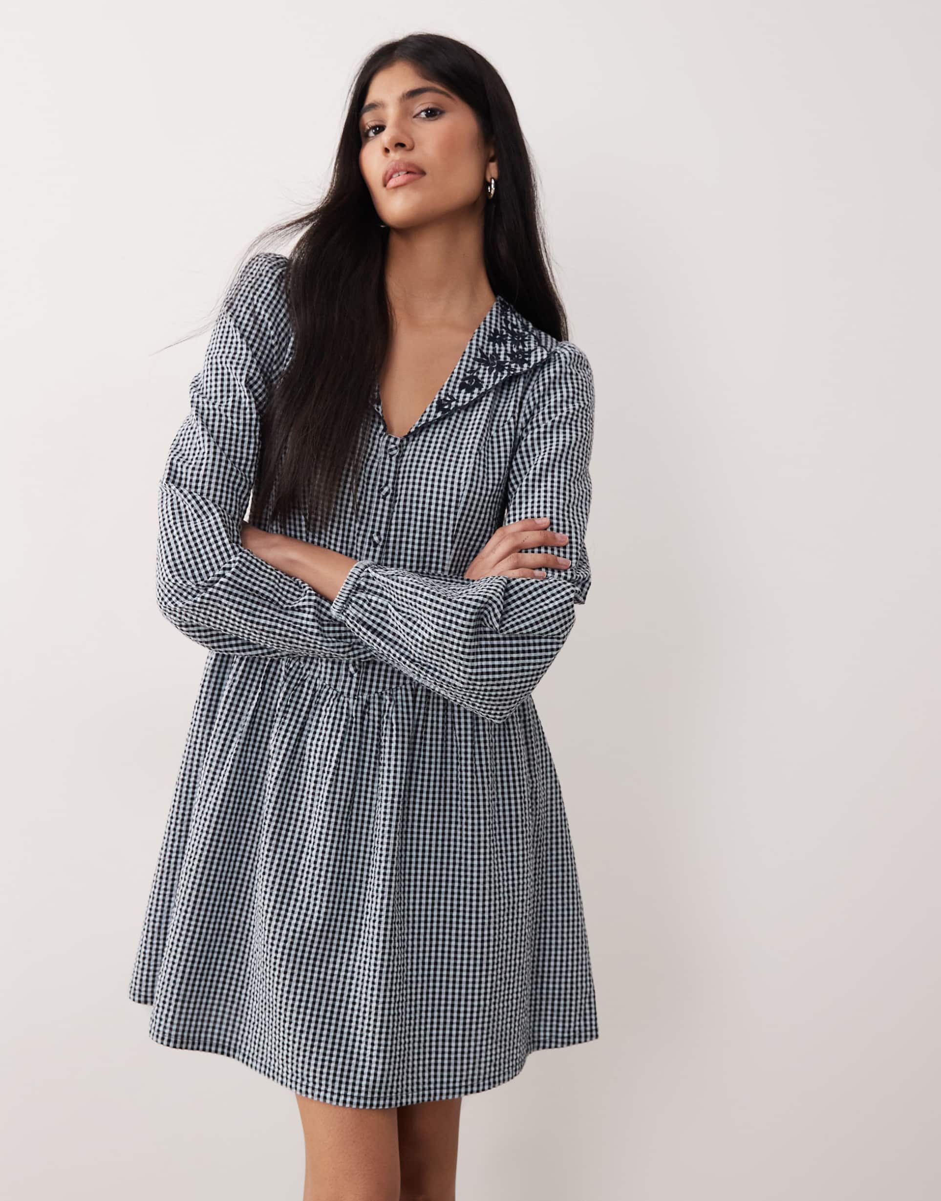 NOBODY'S CHILD SIENNA SCALLOP EGED EMBROIDERED COLLAR BUTTON FRONT MINI DRESS IN BLUE PLAID