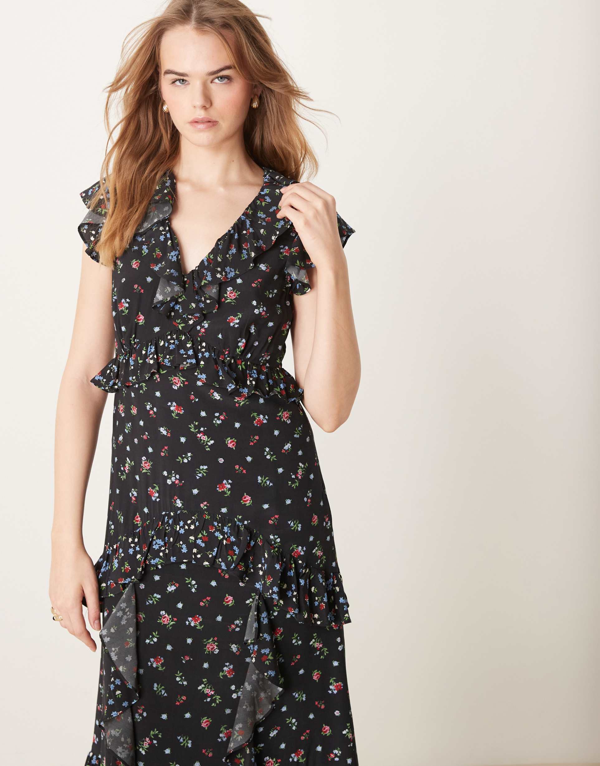 NOBODY'S CHILD SUVI RUFFLE MIDAXI DRESS IN BLACK DITSY