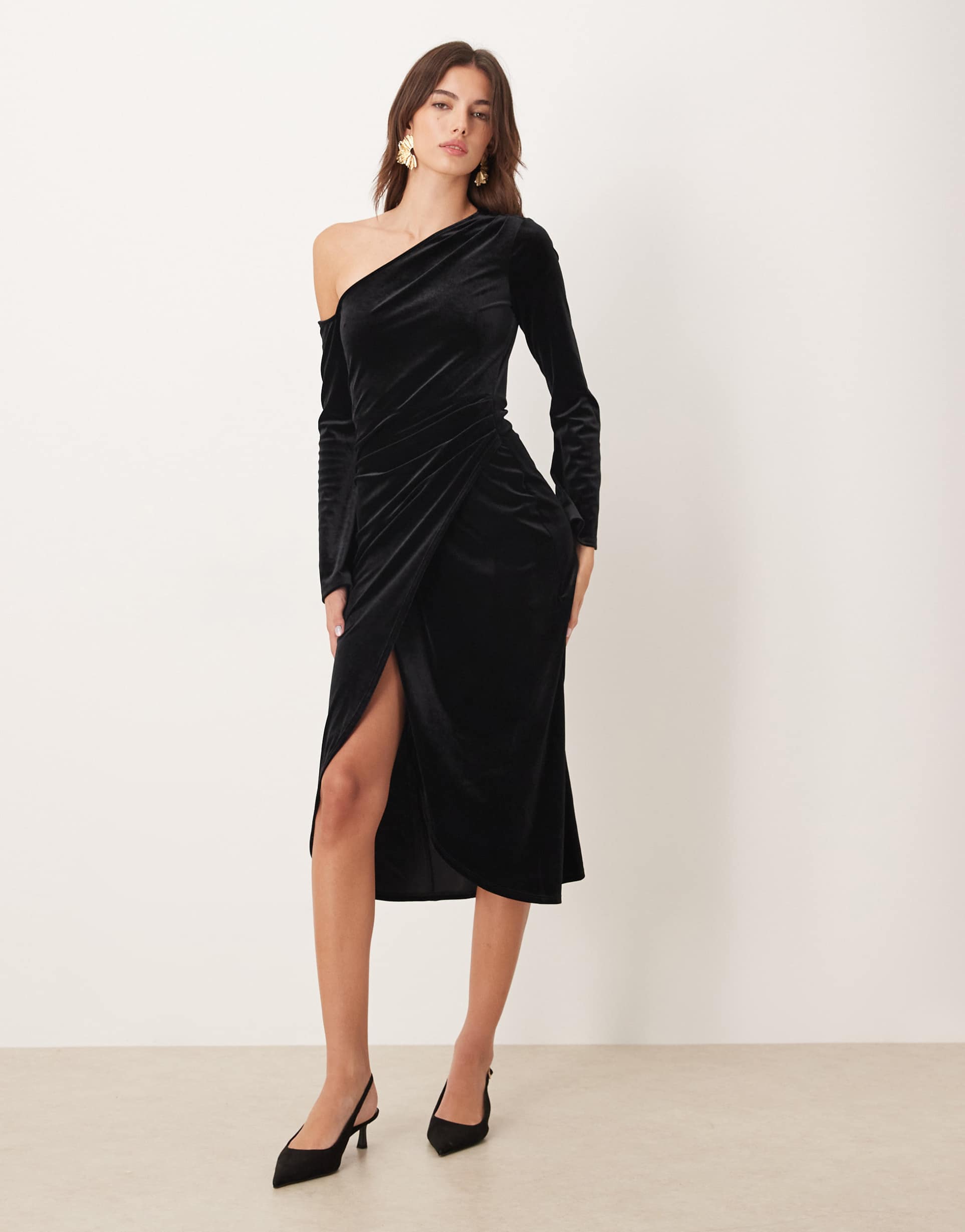 Soft velvet fabric paired with a slim, ruched silhouette creates a striking one-shoulder wrap dress perfect for autumn and winter evenings. The elegant midi length features an asymmetric slit hem that enhances the sophisticated and sexy vibe. Long sleeves and a back zip closure ensure a sleek fit, making it ideal for cocktail parties, date nights, or nights out. This black velvet dress blends classic style with modern details for versatile formal occasions.