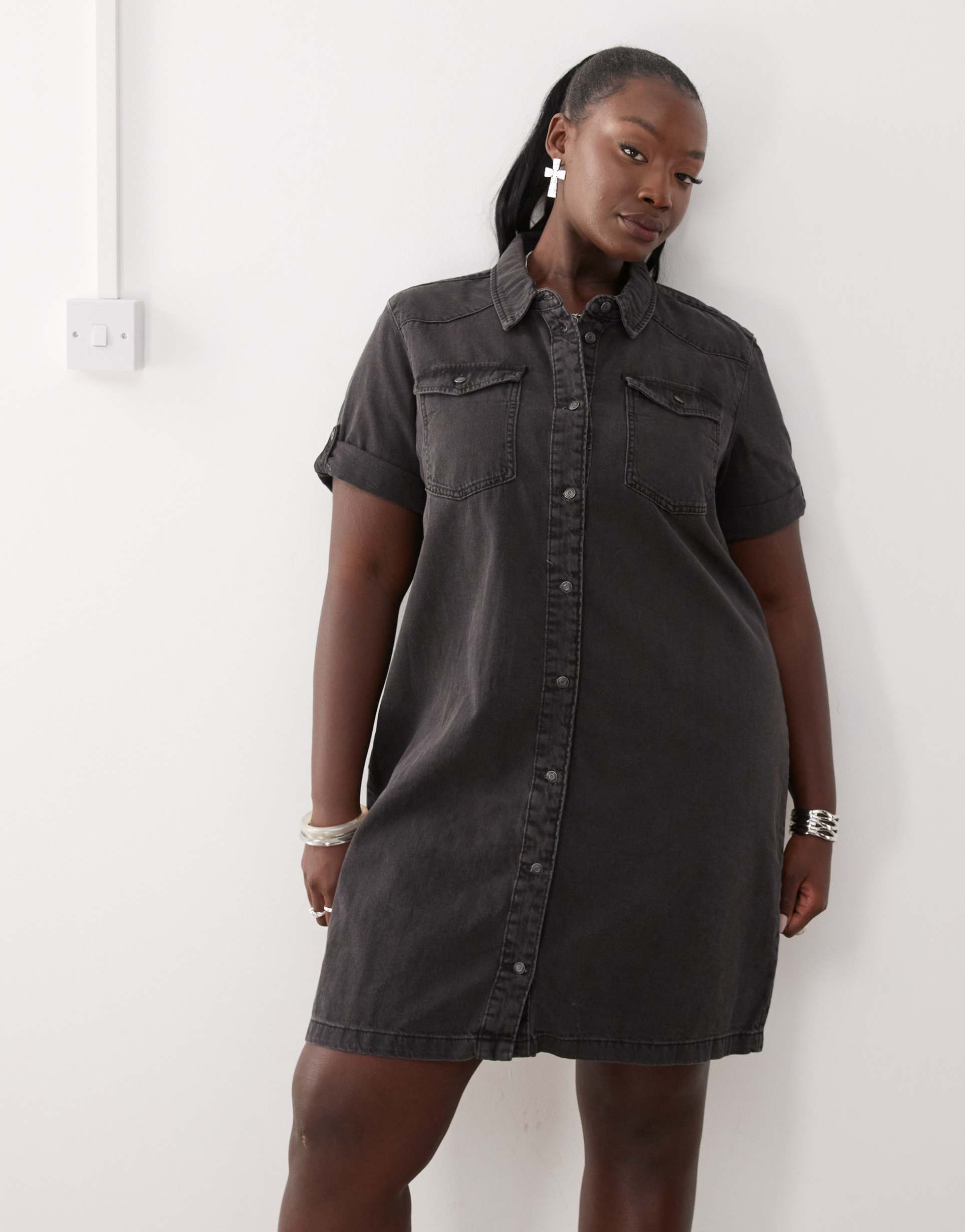 Matte black denim shapes this plus size shirt dress with a classic spread collar and button placket down the front. Its regular fit and clean mini hem offer a versatile silhouette suitable for casual brunches, workwear days, or relaxed everyday outings. The half-length cuffed sleeves add a neat finish while the front chest pockets provide subtle design detail and practicality. Crafted from woven cotton denim, this dress balances comfort with structure, making it an easy-to-style staple for all seasons.