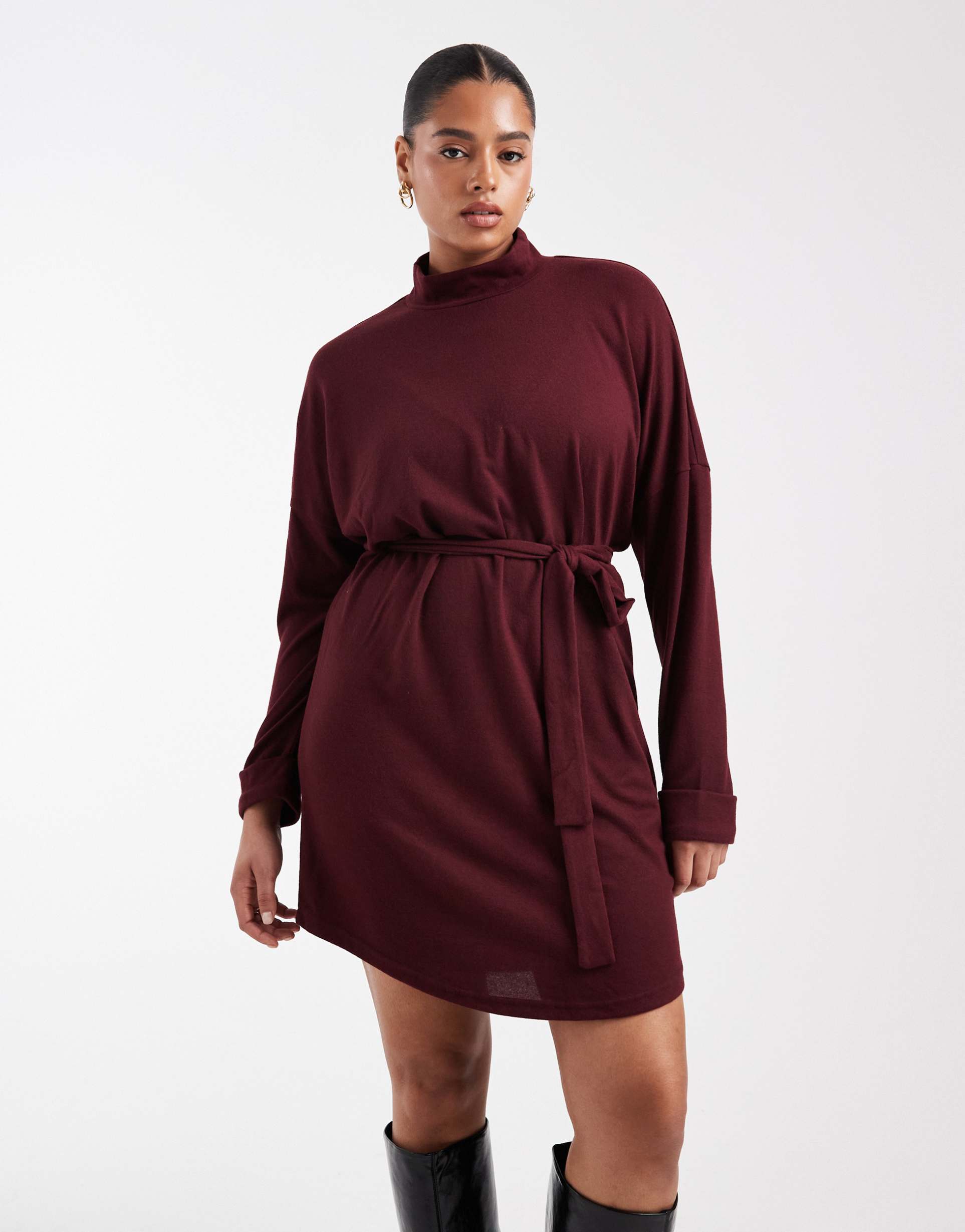 NOISY MAY CURVE TIE WAIST HIGH NECK KNITTED SWEATER DRESS IN BURGUNDY