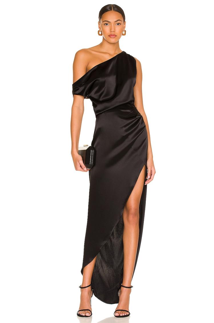 Soft satin fabric and a figure-hugging silhouette create an elegant statement with this one-shoulder slip dress. Featuring an asymmetric neckline and draped bodice with pleated detail at the hip, the fitted design flows into a high-low skirt with a sultry side slit. Ideal for cocktail parties, date nights, or evening events, its sophisticated style and sleek black hue offer versatility across spring, summer, and autumn seasons.