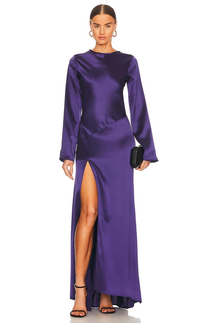 Satin fabric with a rich dark purple hue and a sleek column silhouette create a timeless elegance in this maxi dress. Featuring a round neckline and long sleeves, it offers a sophisticated slim fit that gracefully skims the body. The front slit adds a subtle allure, while the back keyhole with button closure provides a refined finishing touch. Ideal for cocktail evenings, formal occasions, and romantic date nights, this polyester maxi dress combines classic style with modern charm for versatile all-weather wear.