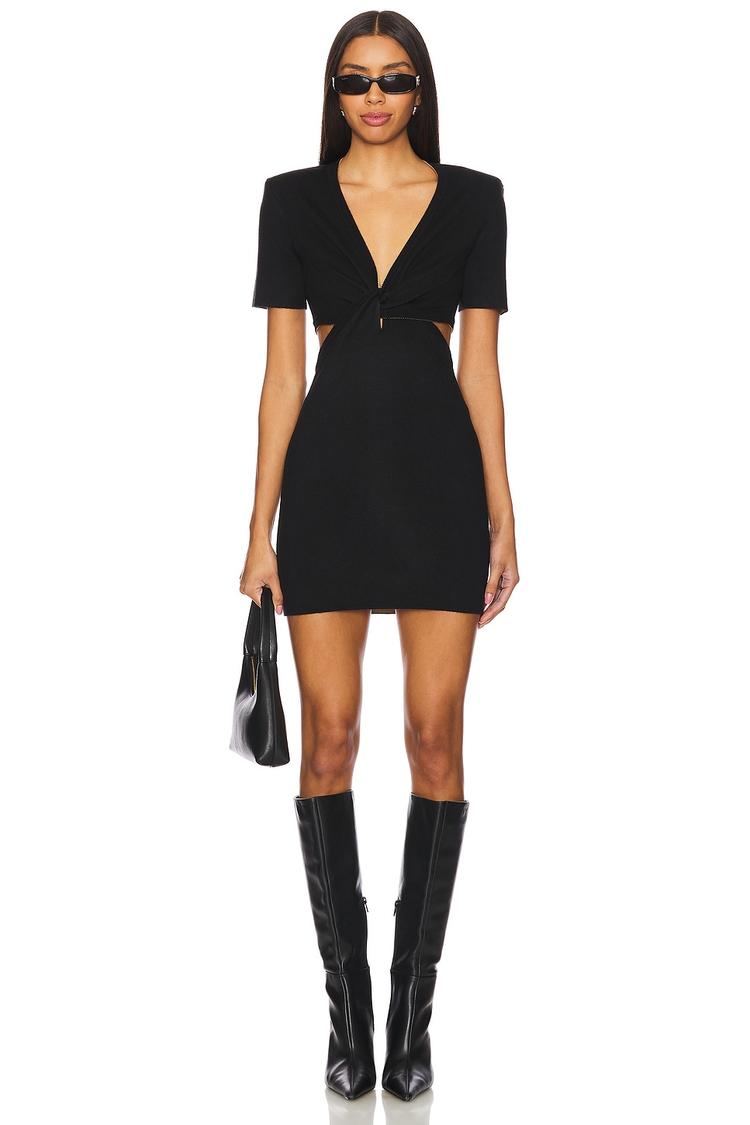 A sleek black mini sheath dress crafted from a midweight slinky knit fabric blends warmth with stretch. Its bodycon fit and plunging neckline create a bold, sexy silhouette, complemented by structured half sleeves with detachable shoulder pads. The clean hemline and slip-on design enhance its modern appeal. Ideal for intimate night outs, cocktail parties, or stylish girls' nights, this dress offers a confident and contemporary look that stands out in cooler seasons like autumn and winter.