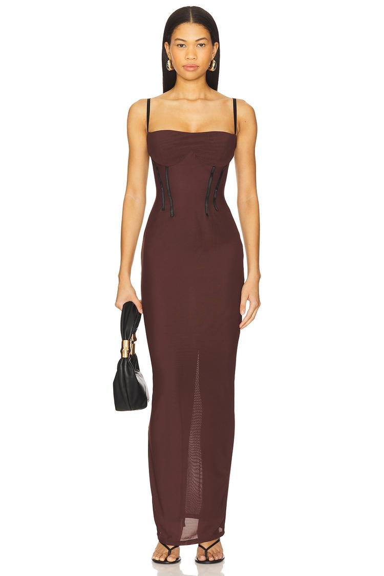A sleek column silhouette in matte burgundy nylon with a fitted shape that contours the body beautifully. This maxi length dress features spaghetti straps and a sophisticated square neckline, enhanced by subtle black contrast trim and underwire for added structure. The back is elegantly covered with a concealed zipper and a stylish split hemline that offers graceful movement. Ideal for cocktail parties, night outs, or romantic date nights, this all-weather dress combines sexy details with timeless sophistication.