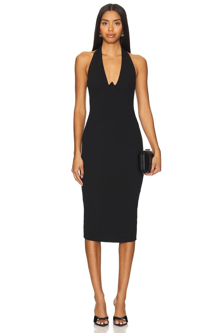 A sleek matte black midi silhouette with a halter neck and front inverted V-wire detail crafts an elegant and sophisticated look. This fitted sheath dress features a concealed back zipper and sleeveless design, made from midweight slinky polyester and elastane jersey fabric for comfortable stretch and a smooth finish. Perfectly suited for cocktail parties, date nights, or a night out, this fully lined dress offers timeless style and versatility for all weather seasons.