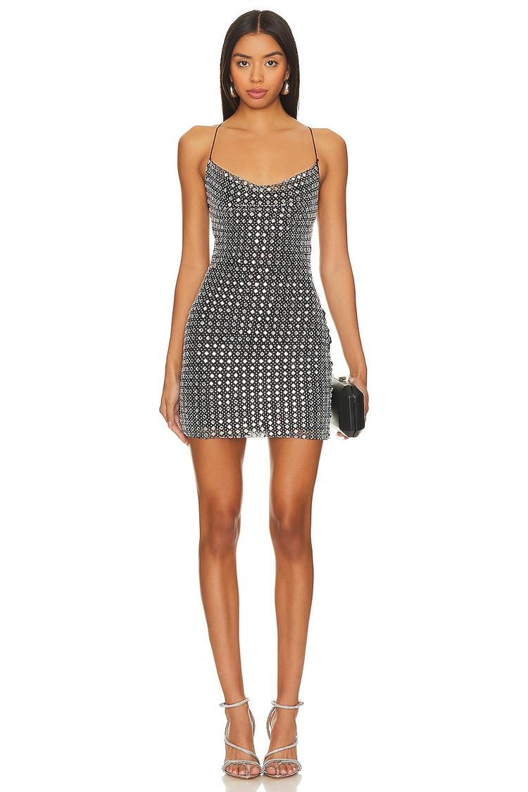 A shimmering mini slip dress features allover crystal embellishments that catch the light with every movement. Crafted from stretchy polyester and elastane, it offers a bodycon fit that hugs the silhouette beautifully. The cowl neckline and delicate spaghetti straps transition into a striking open back with a tie-up closure, adding a sensual edge. Perfect for nights out, cocktail parties, or date nights, this sleek piece combines glamour and contemporary style for a standout look.