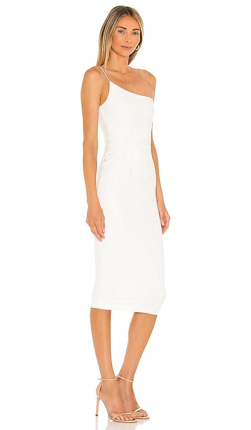 NOOKIE LUST ONE SHOULDER MIDI DRESS IN WHITE.