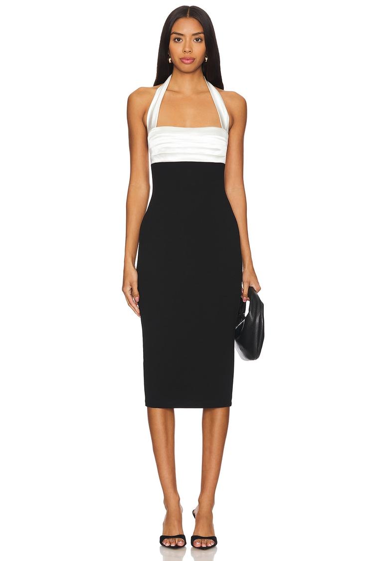 A sleek halterneck top in matte white crepe meets a fitted matte black jersey skirt to create this elegant sheath midi dress. The sleeveless silhouette and back vent add subtle sophistication and ease of movement, perfect for cocktail parties, date nights, or a night out. Crafted from a polyester-elastane blend with full lining and a concealed back zipper, this dress offers both comfort and a flawless fit. Its classic color-block design delivers timeless style with a modern edge, making it a versatile choice for refined evening occasions.